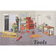 These 1/24-scale tools are perfect for Fujimi's 1/24 garage kit, and you get a lot of them! Includes small hand tools like screwdrivers, pliers, hammers, nippers, wrenches, and more; also includes a fire extinguisher, table and chair, welding equipment and much more! Molded in gray plastic, includes decals and plastic cable.