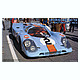 Extremely nice full-detail kit of the Porsche 917K '71 Daytona Winner. Molded in a sort of robin's egg blue, with black interior parts, and black rims. Water-slide decals are included for a snappy finish. Fujimi warns that this is a very old tooling and there may be minor flaws in some parts. We are aware that part #6 (clear headlight cover) has a very mild sink mark in it, which may require some sanding and buffing to get out.