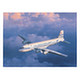 In the years following World War II, as normal passenger service resumed, the market for large passenger aircraft quickly became a face-off between the Douglas DC-4 and the Lockheed Constellation. "Everybody says the Connie is very attractive, but nobody says they think the DC-4 is beautiful," says Koike, with clear dissatisfaction. "In the DC-4, I get a sense of the good ol' dependable American era. The way its nose is scrunched vertically is charming and I think its got an honest beauty about it overall," he offers in support. His painting of the plane shows a beautiful Pan Am DC-4 "Clipper Racer" soaring over a sea of clouds, reflecting the white and blue.