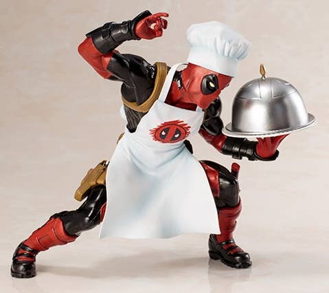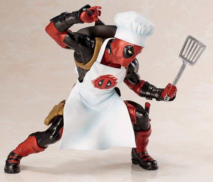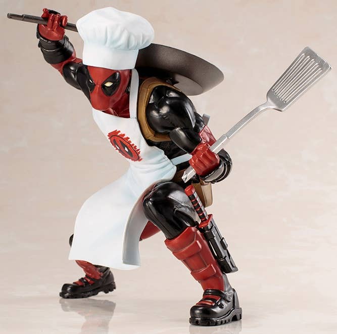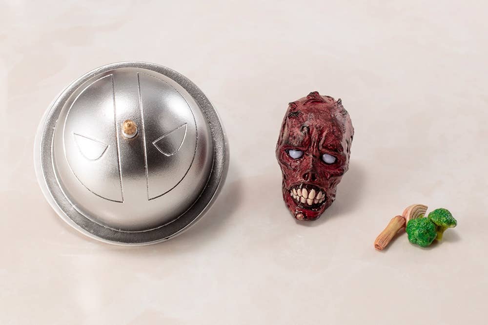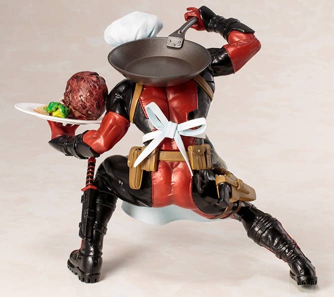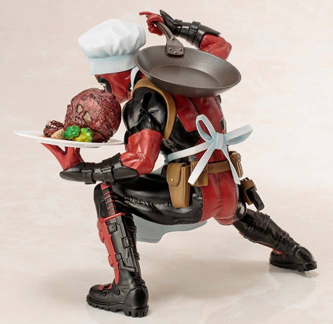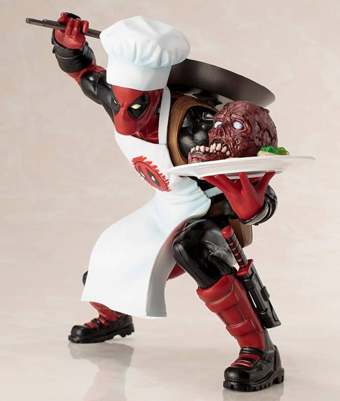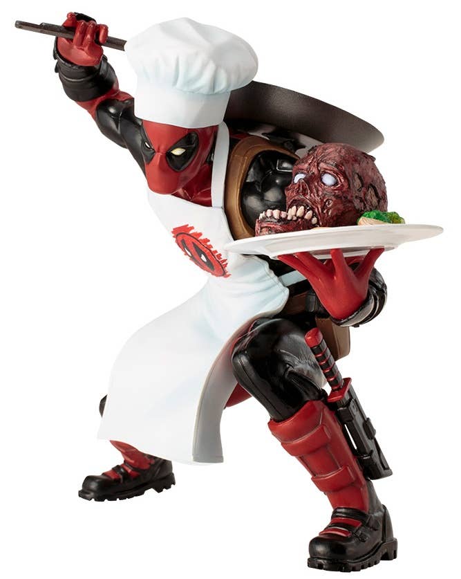 Quick--think of one Marvel character you absolutely would not want in the kitchen! We bet you said "Deadpool" without even a moment's hesitation. And yet, here he is, all round and clever, with a chef's hat and apron, a frying pan, a spatula, and a really gross rotten head on a plate! You can switch the accessories around to heighten the hilarity. He's about 13.5cm tall, and has magnets in his feet to keep him steady on his base. Don't miss out, add this crazy variation of one of Marvel's most popular characters to your lineup today!