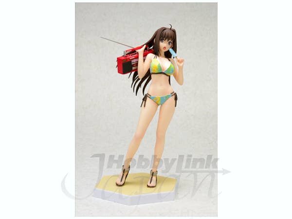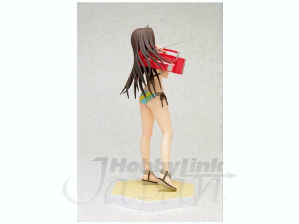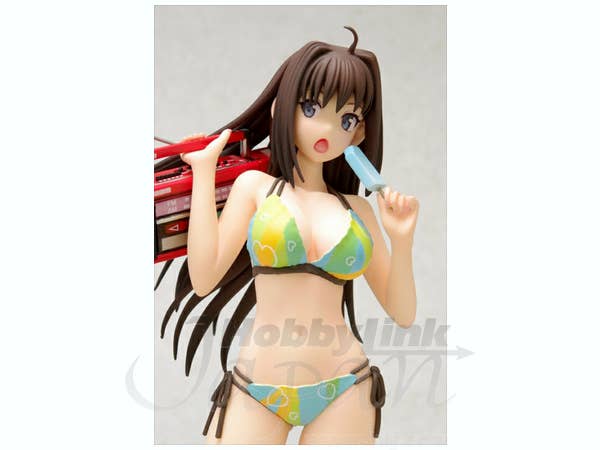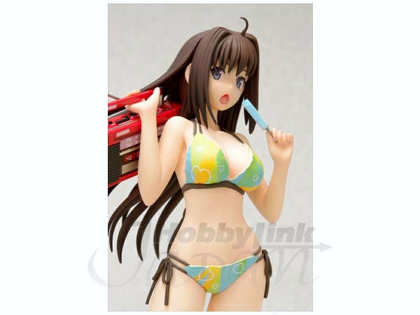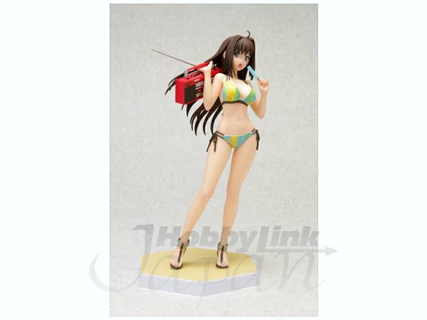 Aoko Aozaki from "Mahoutsukai no Yoru" is fully prepared for a fun day at the beach! Wearing a colorful bikini, she's carrying a bright red boom box and eating a popsicle, too. She's about 16.5cm tall, and comes with a sand-textured base to stand on. Order her today and let the summer begin!