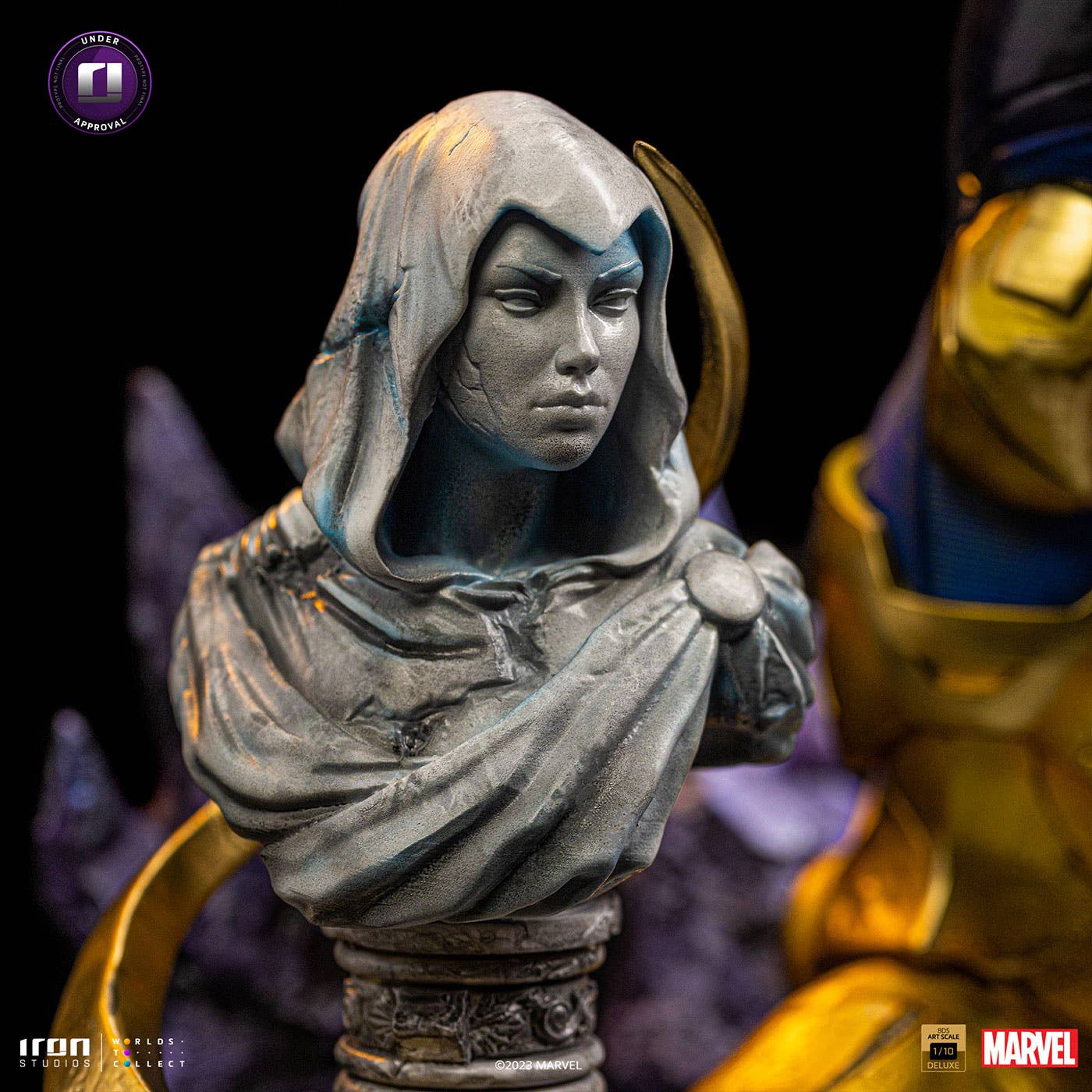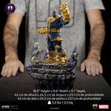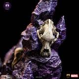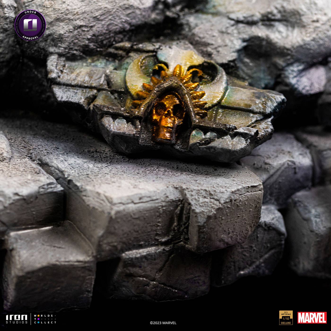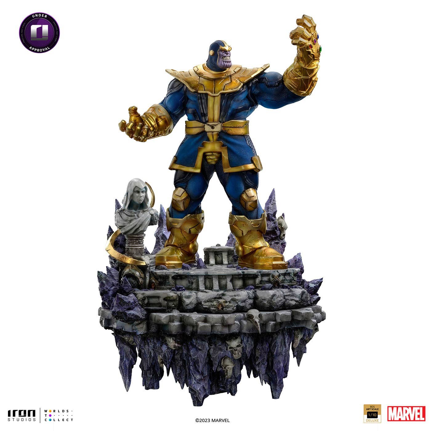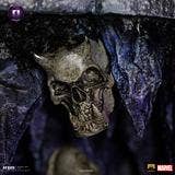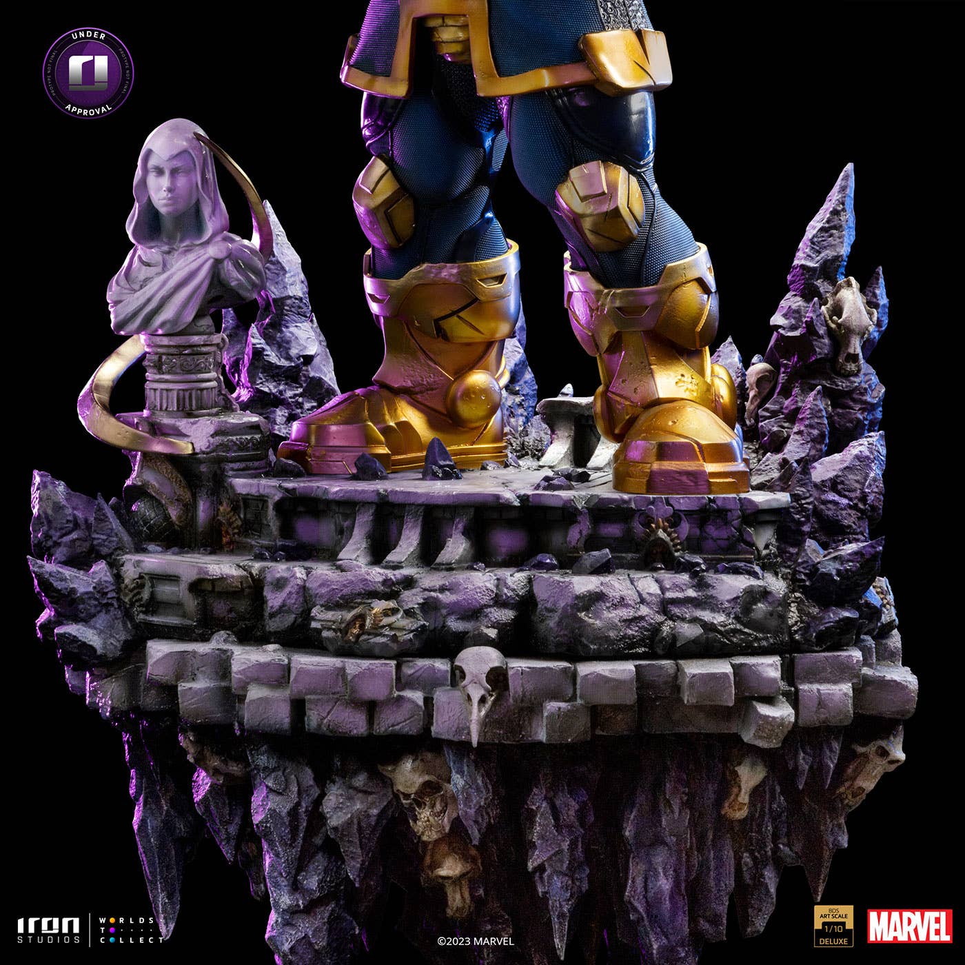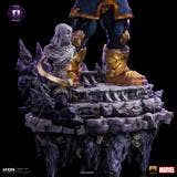 Iron Studios brings us a new "Deluxe Battle Diorama" display figure of the mighty Thanos from Marvel Comics! This supremely powerful villain is seen with the Infinity Gauntlet on his left hand, raising it high in triumph with a ghastly grin on his face. This figure has been elaborately sculpted down to the smallest detail -- even his teeth! -- and hand-painted for the highest quality. The highly detailed base on this deluxe version features the temple of the goddess of Death, and an interchangeable head with a more somber expression is included too. Don't miss this opportunity to add this classic character to your collection -- place your order today!