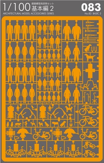 This, the 83rd entry in the Architectural Model Accessories Series, builds a variety of basic parts in orange paper to supplement other sets. Parts for people, bicycles, strollers, and more are included.