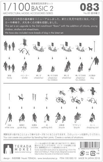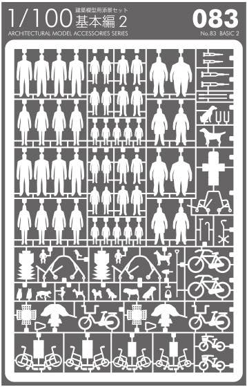 This, the 83rd entry in the Architectural Model Accessories Series, builds a variety of basic parts in white paper to supplement other sets. Parts for people, bicycles, strollers, and more are included.