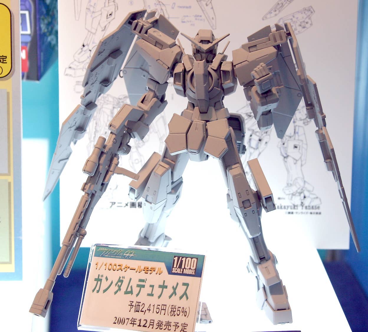 This second entry in Bandai's 1/100-scale, non-grade "Gundam 00" plastic kit series is the sharpshooter Gundam Dynames, as piloted by Lockon Stratos in the show. Sharply molded in color parts, Gundam Dynames will be fully poseable after completion with its polycap joints allowing for a wide range of dynamic poses. Features include foldable shoulder antennas, the antenna on its head that can slide down for gun camera mode, flexible GN shield, and a removable GN full shield attachment that can fold out to guard the Mobile Suit's front. Gundam Dynames is well armed with weaponry including a GN sniper rifle, twin GN beam pistols that can be stored in its holsters, and two GN beam sabers. Not a drop of glue or paint required (although painting will improve the finished results)! A sheet of foil stickers is included for detail along with a joint part for use with Bandai's Action Base 1 to set Gundam Dynames in mid-air poses.