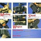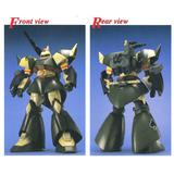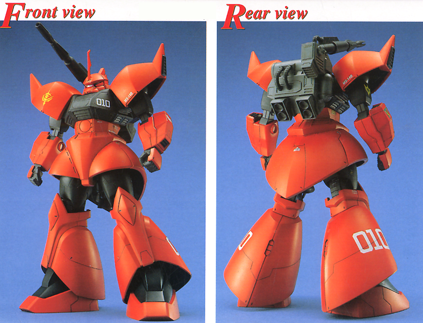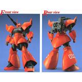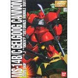 The Gelgoog Cannon kit is essentially a color variation from the original MG Gelgoog kit (see that listing for details), though it does contain one additional runner of parts -- those for the cannon backpack unit as well as the arm-mounted shield and gun unit. Some other minor details (such as the scribing pattern on the soles of the feet) also differ. Kit can be completed as either the B or C-model (i.e. two different backpack units are included). Note that the kit is snap-assembly like all MG kits, but is molded in the gray and red color shown on the left, below. The beige and gray variation at right would require painting.