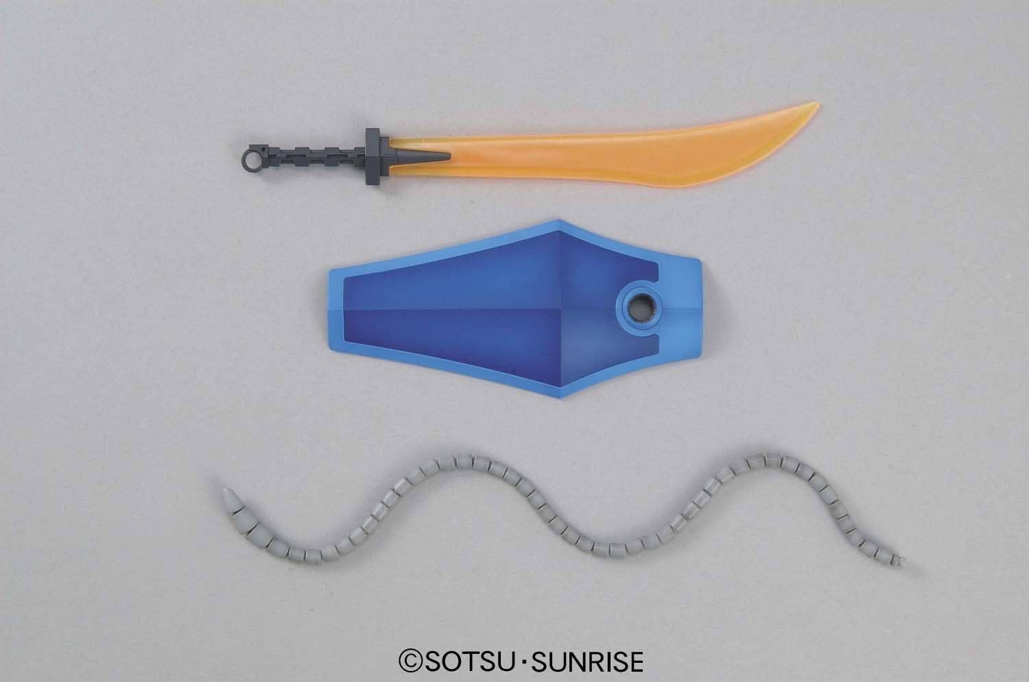 Its signature weaponry includes a shield, a Heat Saber, a Heat Rod, and a Finger Vulcan for its left hand. A regular manipulator left hand is also included to replace the Finger Vulcan if you so desire. Each section of the Heat Rod is ball-jointed so you can bend it into any shape you want! The blade part of the Heat Saber is made of clear orange, and the Mobile Suit's cockpit can slide open to reveal a sitting-pose pilot figure (molded in light blue). Also packed in the set are in-scale figures (molded in light blue) of Ramba Ral and his aide Crowley Hamon. A sheet of stickers and dry-transfer markings are included.