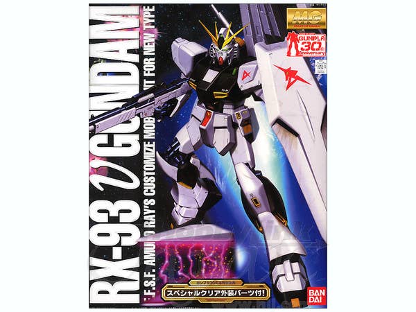 Part of Bandai's MG Clear Parts Campaign in celebration of the 30th anniversary of Gunpla, this reissue of MG Nu Gundam comes with optional clear armor parts for the sections shown in the photos below. The clear armor parts come molded on one plastic runner. Everything else remains the same as its initial release.