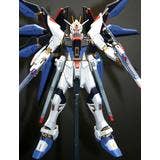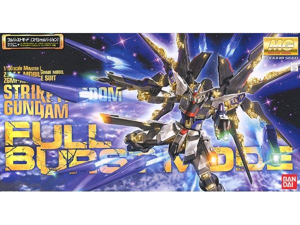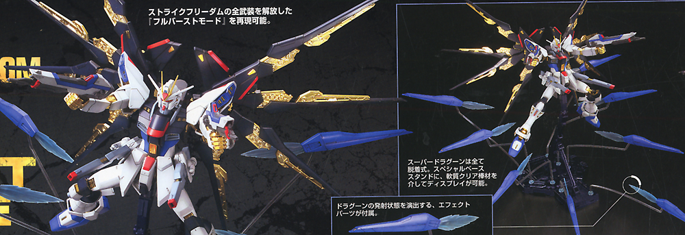 Bandai has gone all out in making this one of the best Master Grade releases ever with not just one but two MG versions (normal and full burst mode) of everybody's favorite mobile suit, Strike Freedom Gundam, and what an amazing kit it turned out to be! This full burst mode special version box comes packed with the same MG kit as the normal version of MG Strike Freedom Gundam except that this special box include gold coating parts, Dragoon effect parts, a special clear blue base stand, and a clear illustration poster of Strike Freedom vs Destiny. Clear stands for each Dragoon are included, which can be attached to the special base stand and display them being sent flying out to its target(s). Stickers and custom decal markings are included to detail-up the completed Strike Freedom Gundam kit. Needless to say, this is THE MG kit to get for fans of this spectacular mobile suit!