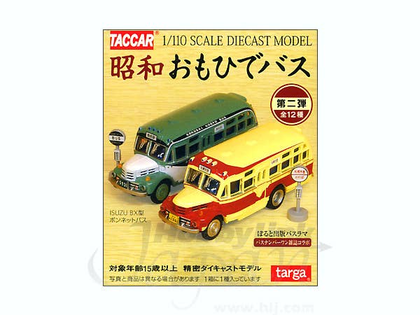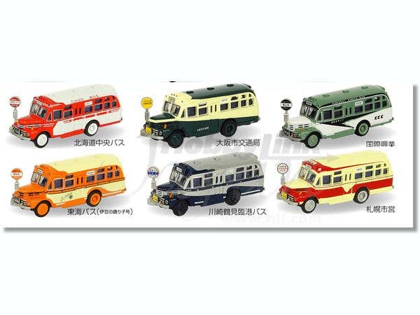 A collection of old buses, from Japan's immensely nostalgic Showa Era (1925-1989)! There's a total of twelve possible types, as shown here. Each bus includes a bus stop sign! Please note that these are trading items and are individually sealed and randomly packed in boxes of 12 by the manufacturer before shipment to HobbyLink Japan. As a result we are unable to honor requests for individual or specific items, nor can we promise you which one(s) you will receive in a box. Please order only if you are willing to accept any of the 12 possible types.