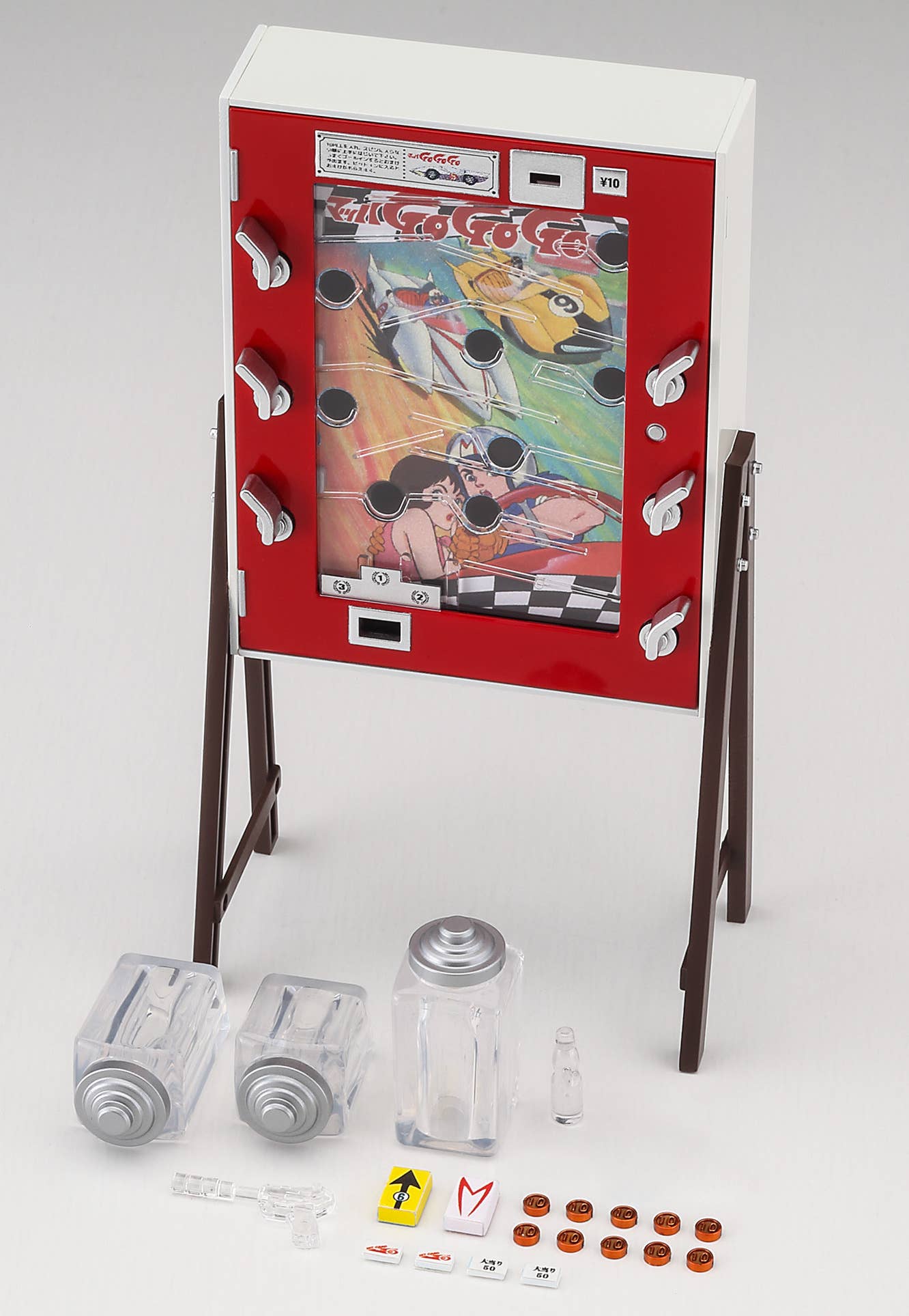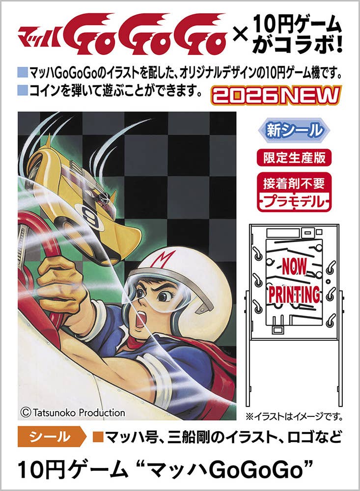 Hasegawa brings us a 1/12-scale model kit of an original ten-yen game machine featuring illustrations from "Mach Go Go Go"! Stickers are included for the game machine's front panel and candy packaging, and a wide variety of bonus parts are included too: coins, a trophy (Hot Cat Tongue-Burning Taro), prize tickets, various candy items, a ramune bottle and a candy bottle. Your 1/12-scale figures will love it -- order yours today!