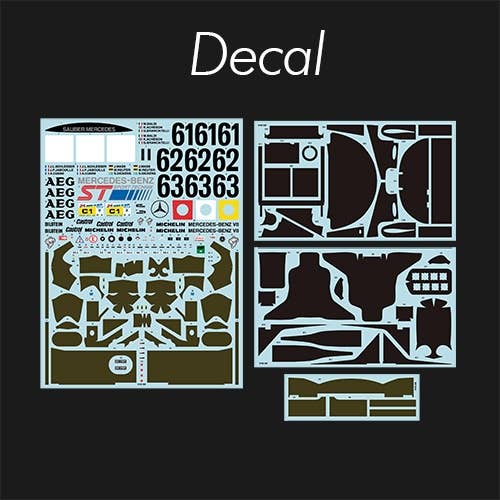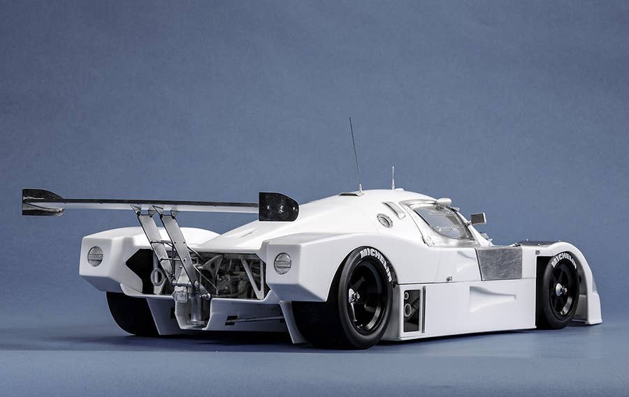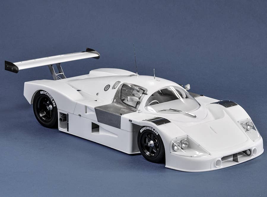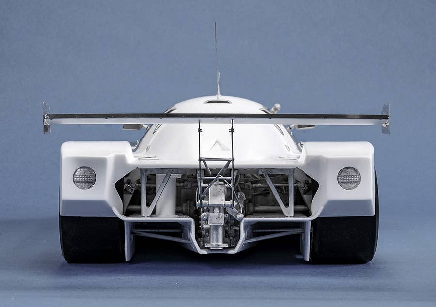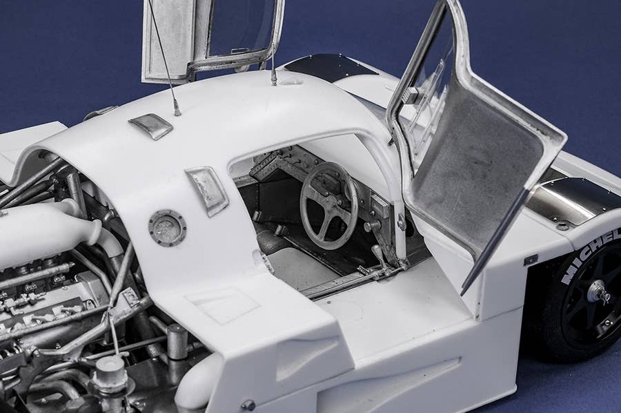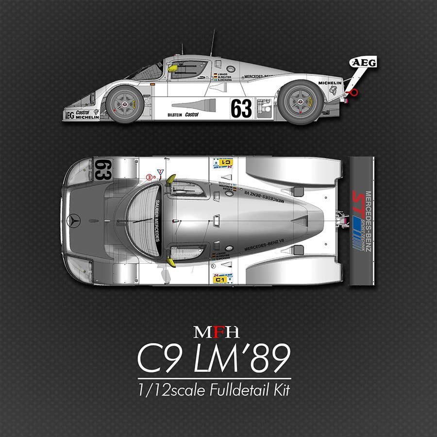 This intensely detailed model kit from Model Factory Hiro duplicates the overall winner of the 1989 Le Mans race, the C9 numbered 63 and driven by J. Mass, M. Reuter and S. Dickens. This multi-material kit uses white metal, urethane resin, turned metal parts, photo-etched parts, rubber tires, decals and various cords. The wheels and headlight rims are made of aluminum, and the wheels have a black anodized finish. the front and rear cowls can be removed and the doors opened and closed, allowing you to see the internal structure after completion. The rubber tires are painted with the manufacturer logo, too. Order this spectacular kit for your own today!