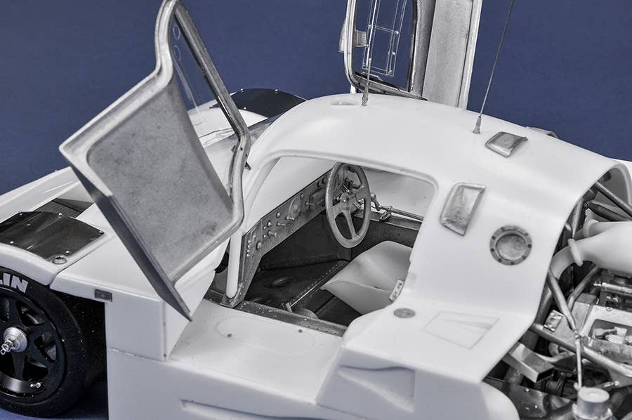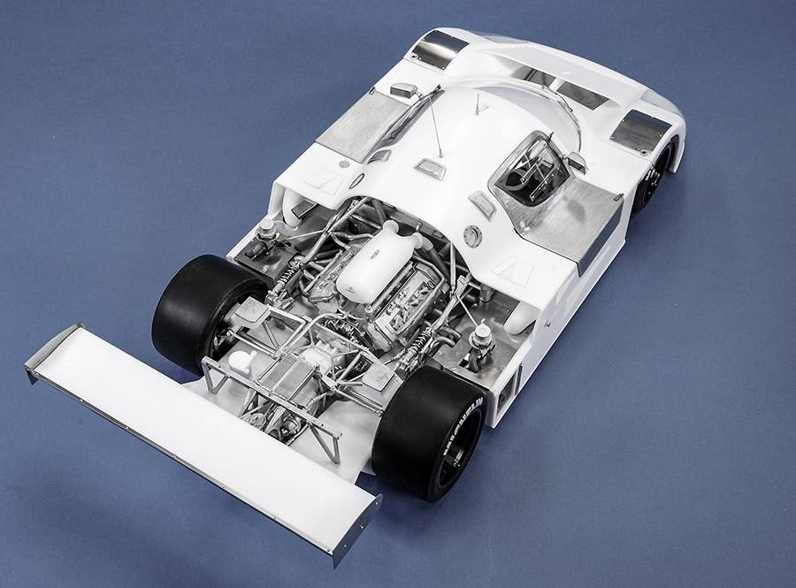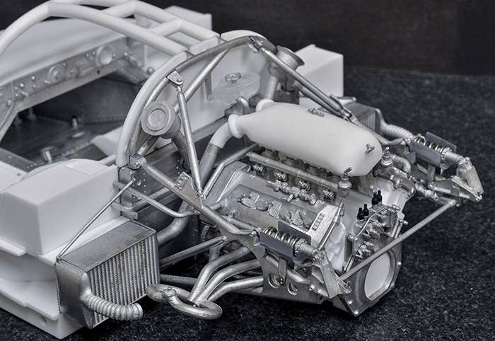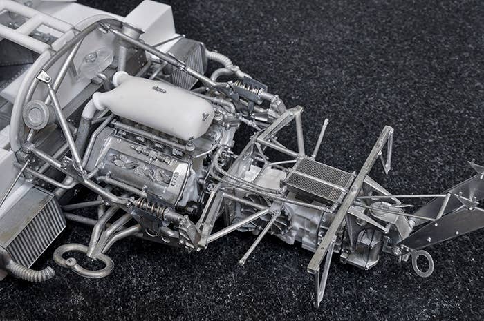 This is a racing car model kit assembled from parts made of resin, white metal, photo-etched metal and possibly other materials.
