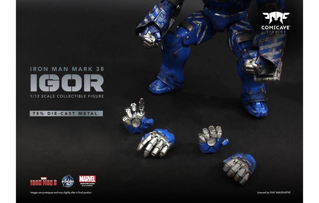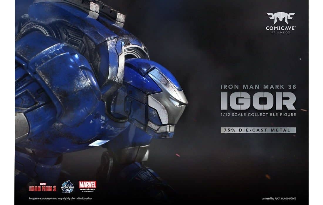 The Super Alloy 1/12 Scale Igor is a fully articualted figurine with interchangeable hands (1 fisted pair, one articulated pair, and one semi-clenched pair), and LED light features in the eyes and chest. Designed as a heavy lifting suit, the Mark XXXVIII (38) is capable of lifting massive objects ten times its size. Made from 75% metal alloy, with over 60 points of articulation; about 20cm tall.