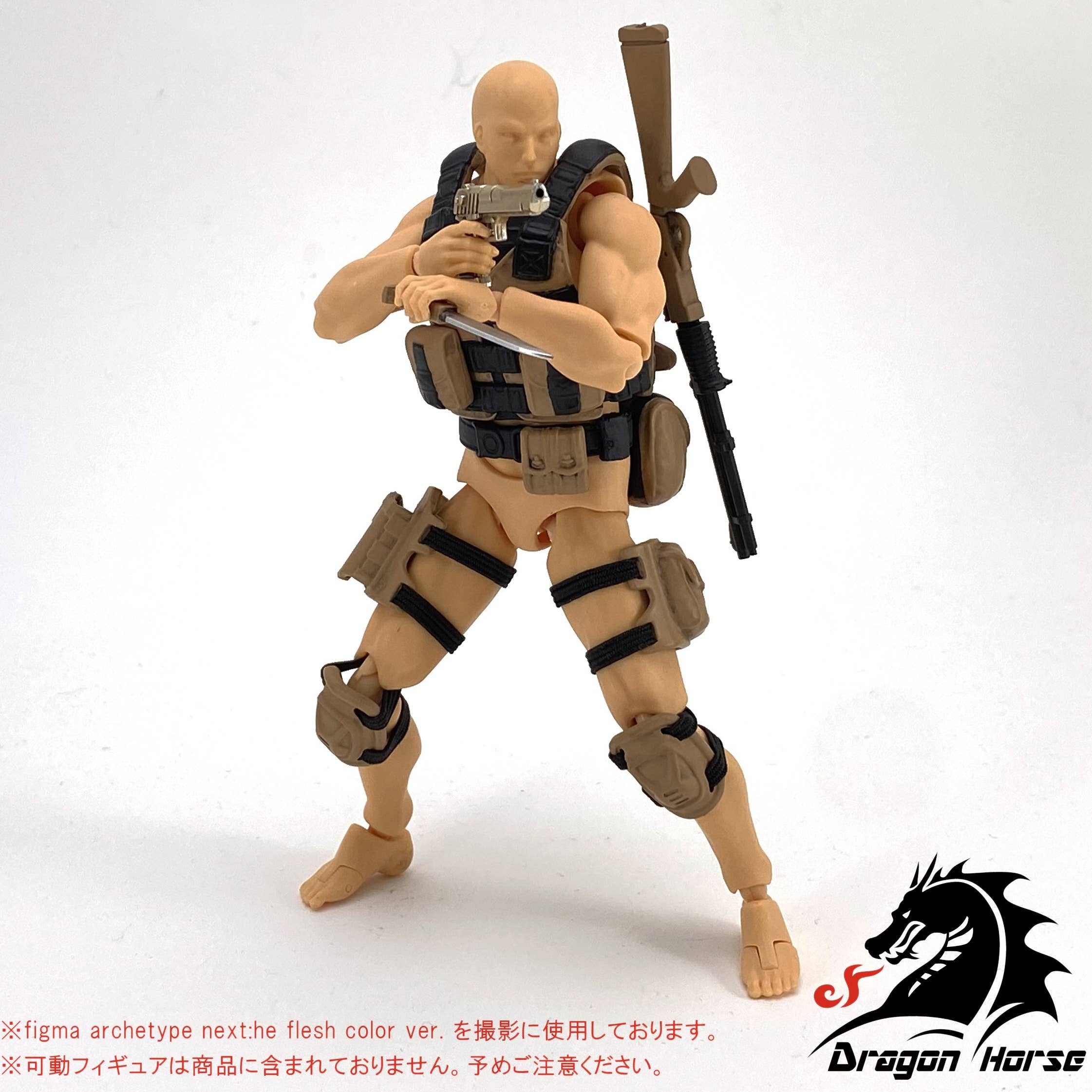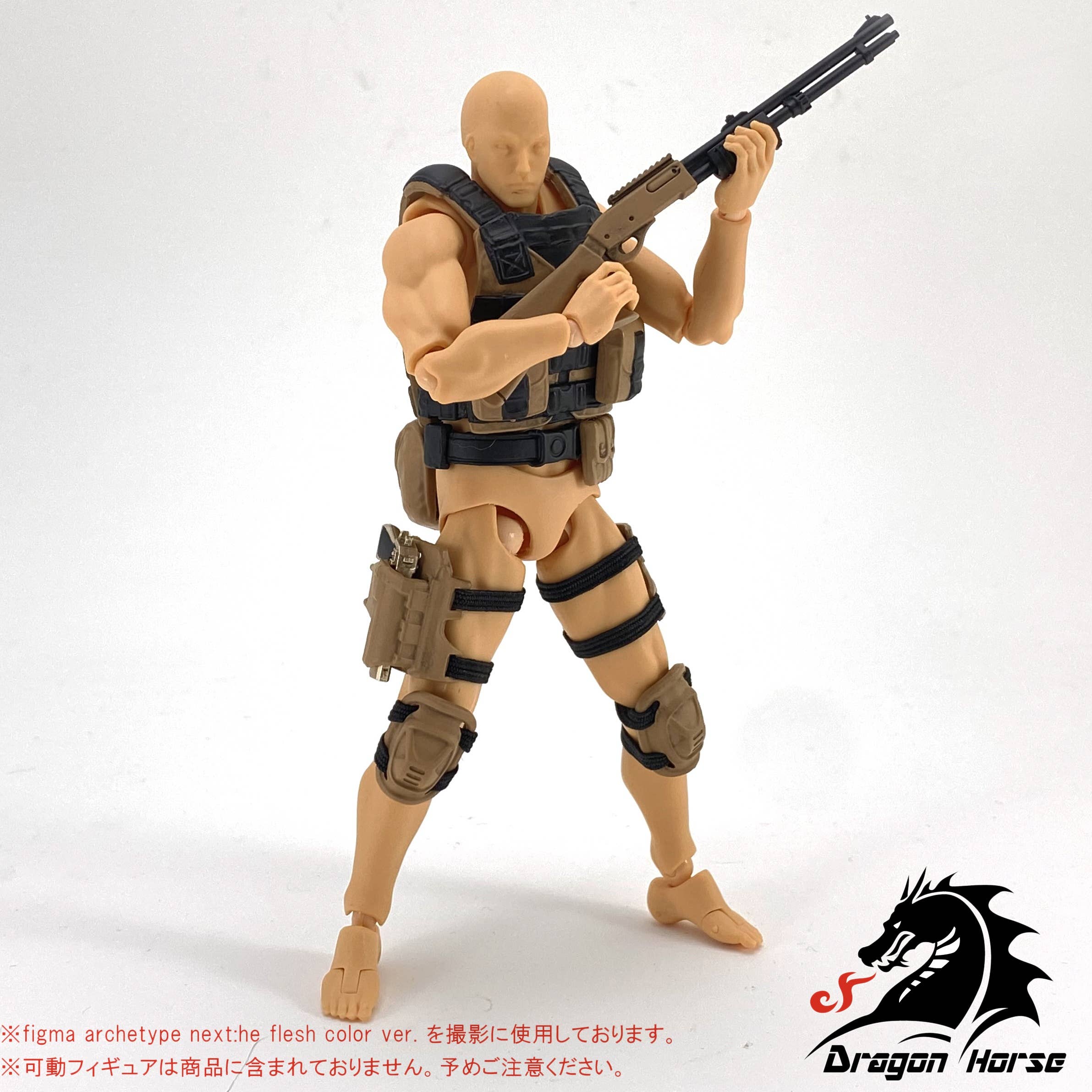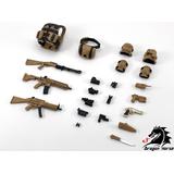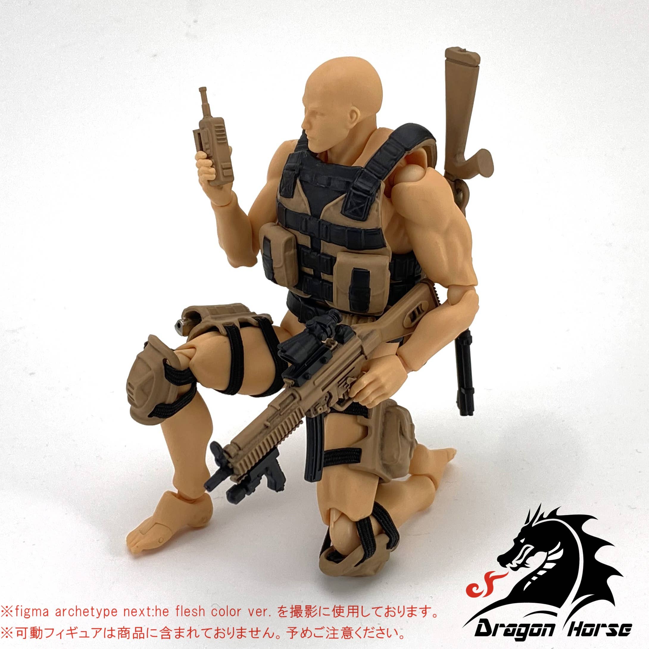 Outfit your 1/12-scale figures for desert combat with this accessory set from Dragonhorse! The centerpiece is an HK416 assault rifle, with lots of accessories for customization, as well as various armor pieces, pistols, a knife, and more. Order yours now!