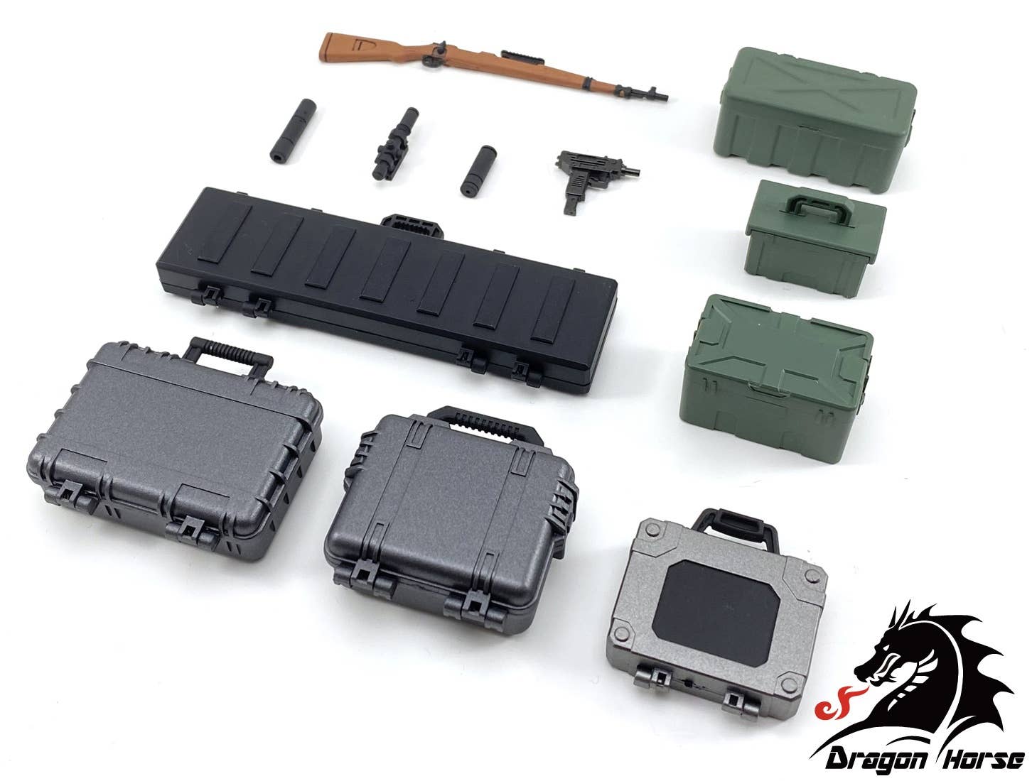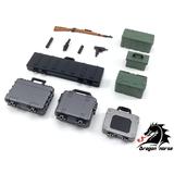 If your 1/12-scale figures have no way to store and carry their weapons and other such items, Dragon Horse comes to the rescue! This set includes various cases often used in military systems, such as ammunition cases, hard cases for storing equipment, and carrying cases for rifles. An attache-type gun case and carrying case for an Uzi submachine gun and Kar98K rifle are also included! Order yours today!