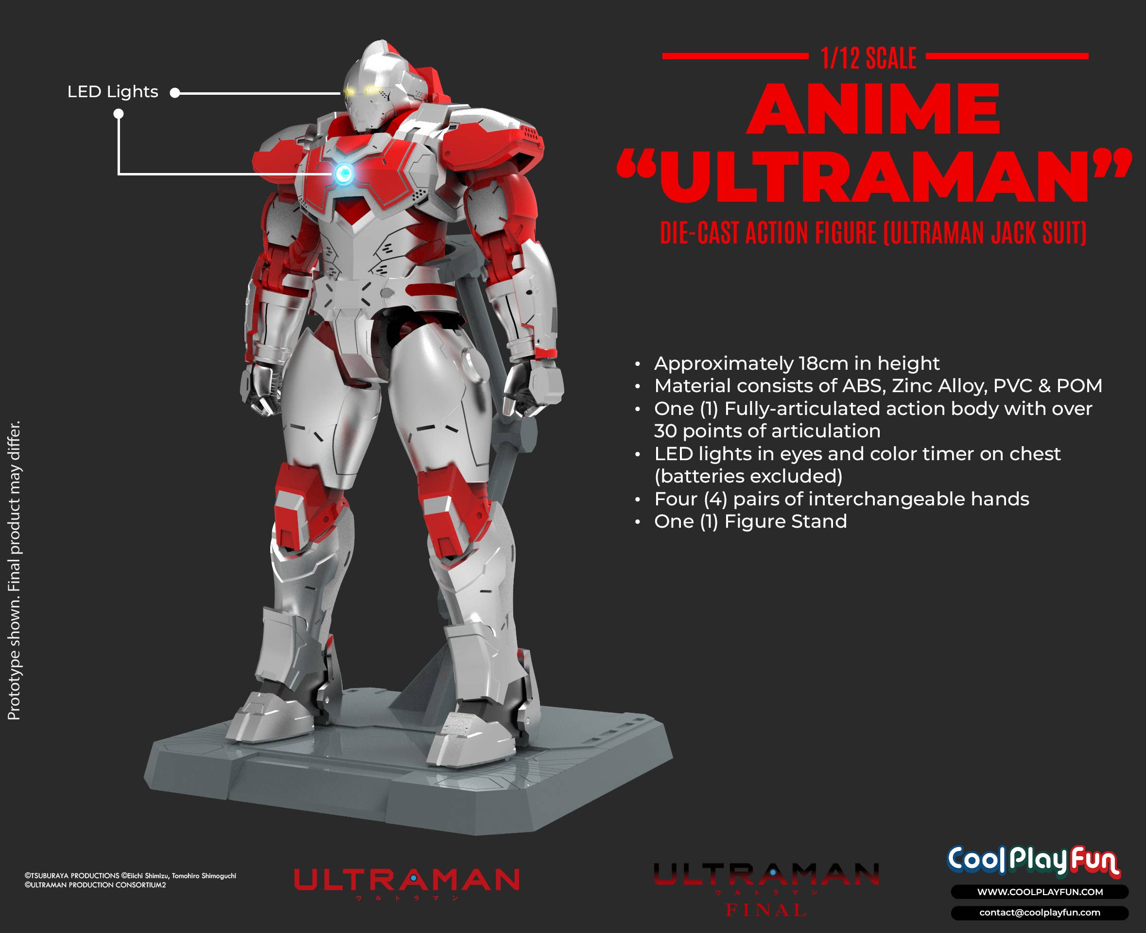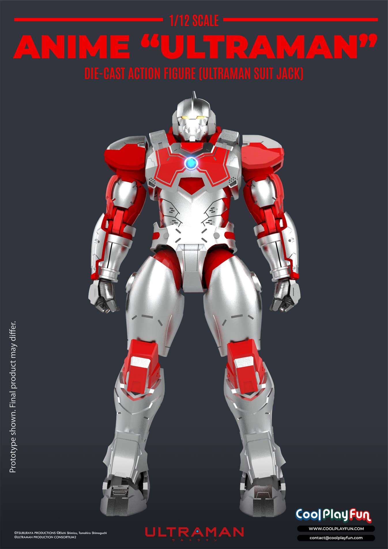 CoolPlayFun brings us a new 1/12-scale die-cast action figure of the massively proportioned Ultraman Suit Jack, based on the recent anime version! He's got over 30 points of articulation for maximum posability, and comes with interchangeable hands and a stand for display. In addition, his eyes and color timer light up thanks to LEDs! Order him for your own collection today!