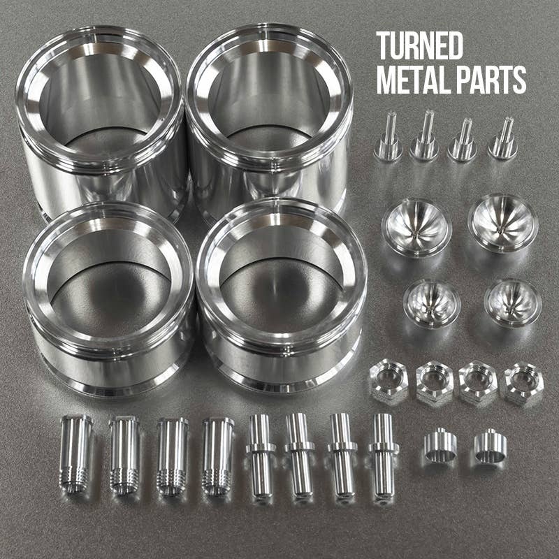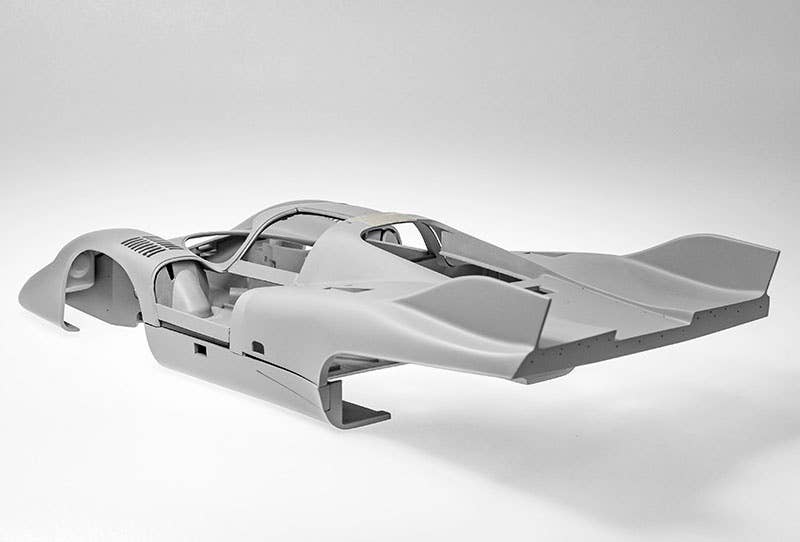 This is a racing car model kit assembled from parts made of resin, white metal, photo-etched metal and possibly other materials.