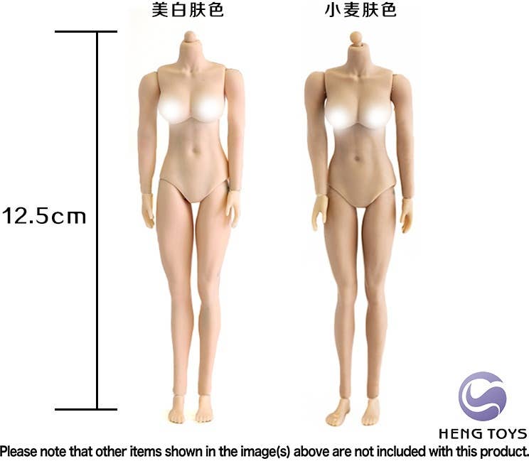Attention doll and figure customizers! Heng Toys brings us a 1/12-scale seamless female doll body, highly posable with an internal steel skeleton for strength, with a wide variety of bust sizes and two skin tones. A head and clothing are not included -- those are up to you. Interchangeable hands and feet are provided. This is the wheat-skin version with a very large-sized bustline. Make her yours today!