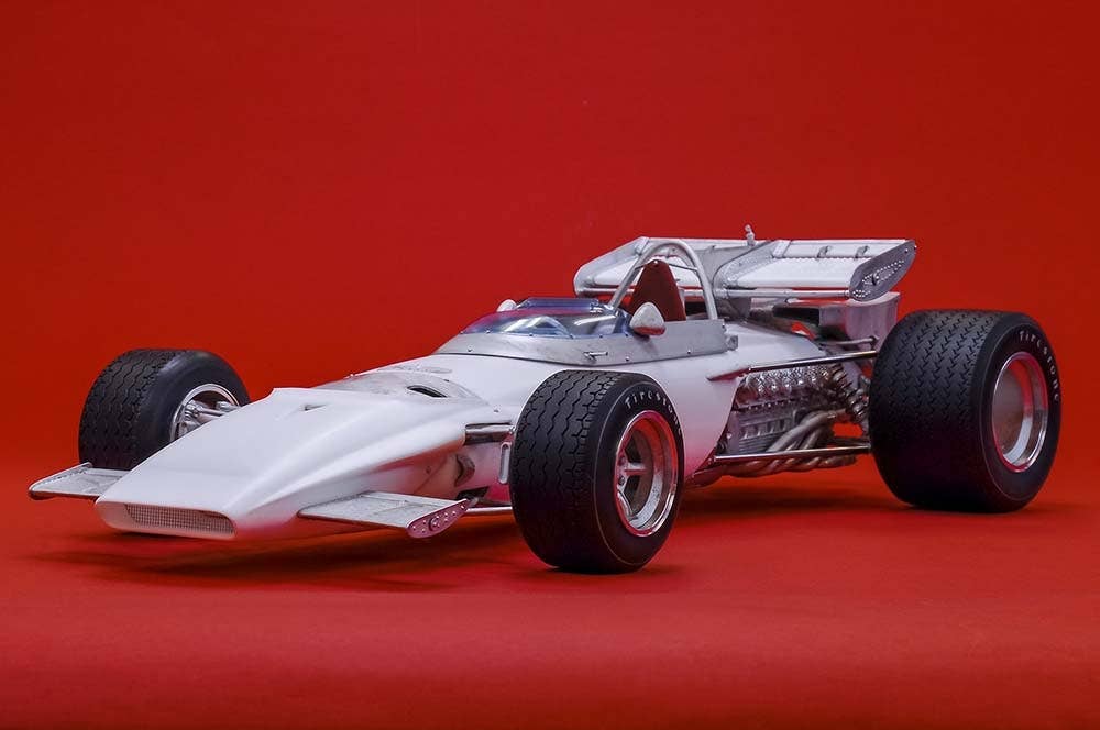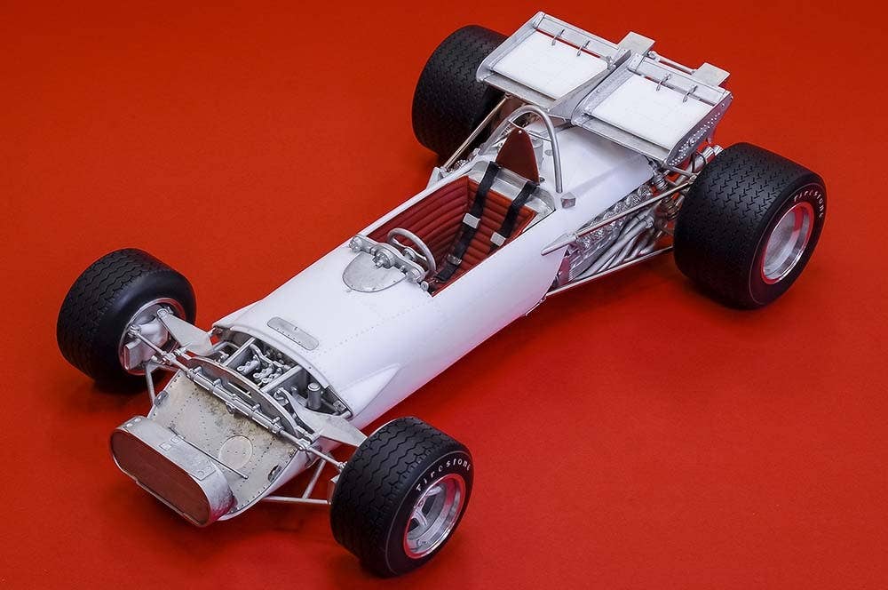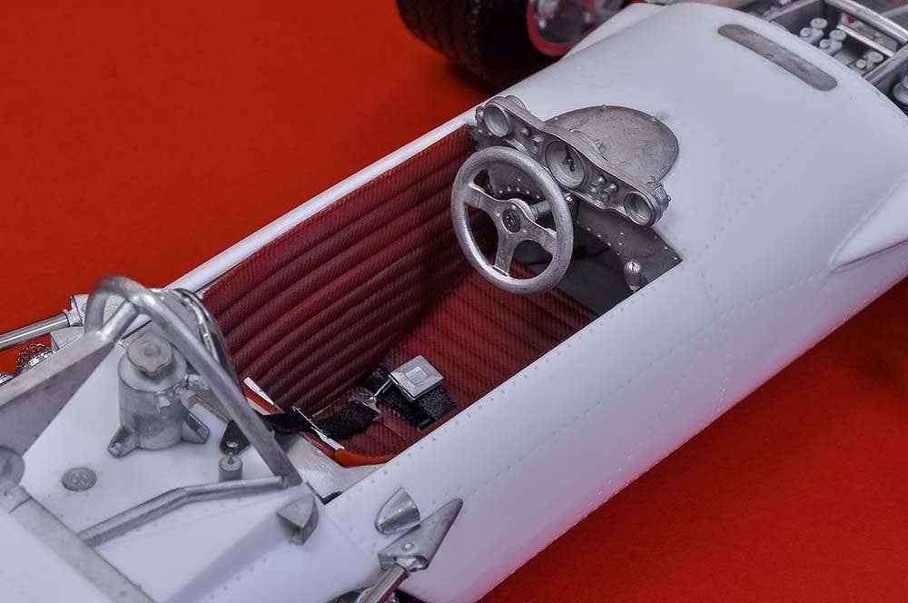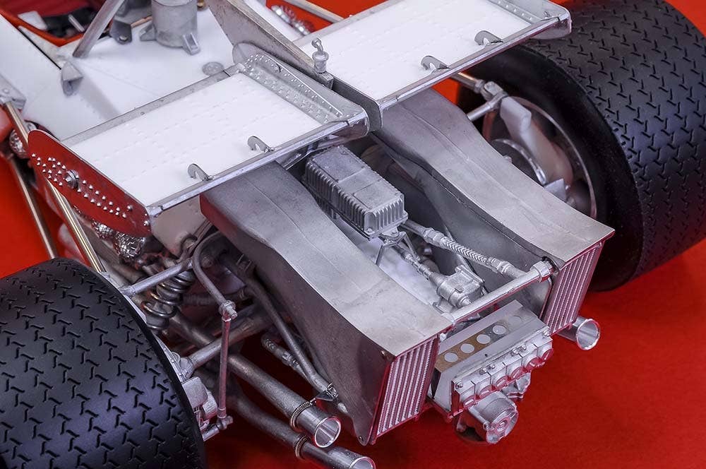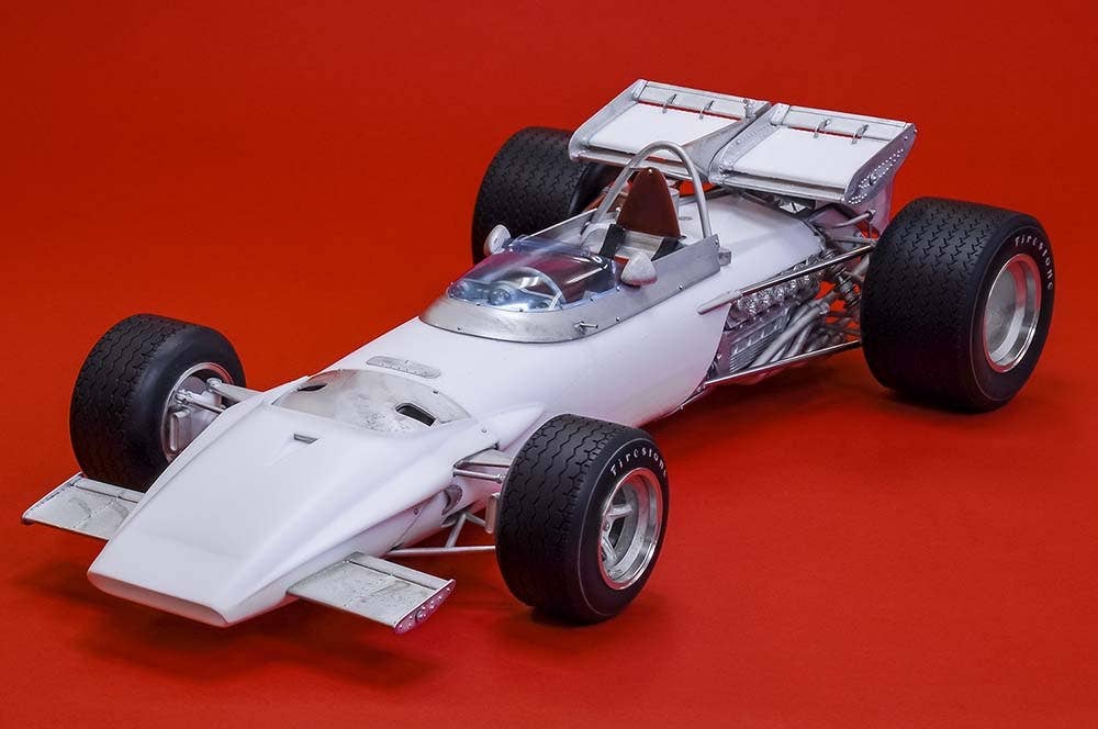 This is a racing car model kit assembled from parts made of resin, white metal, photo-etched metal and possibly other materials.