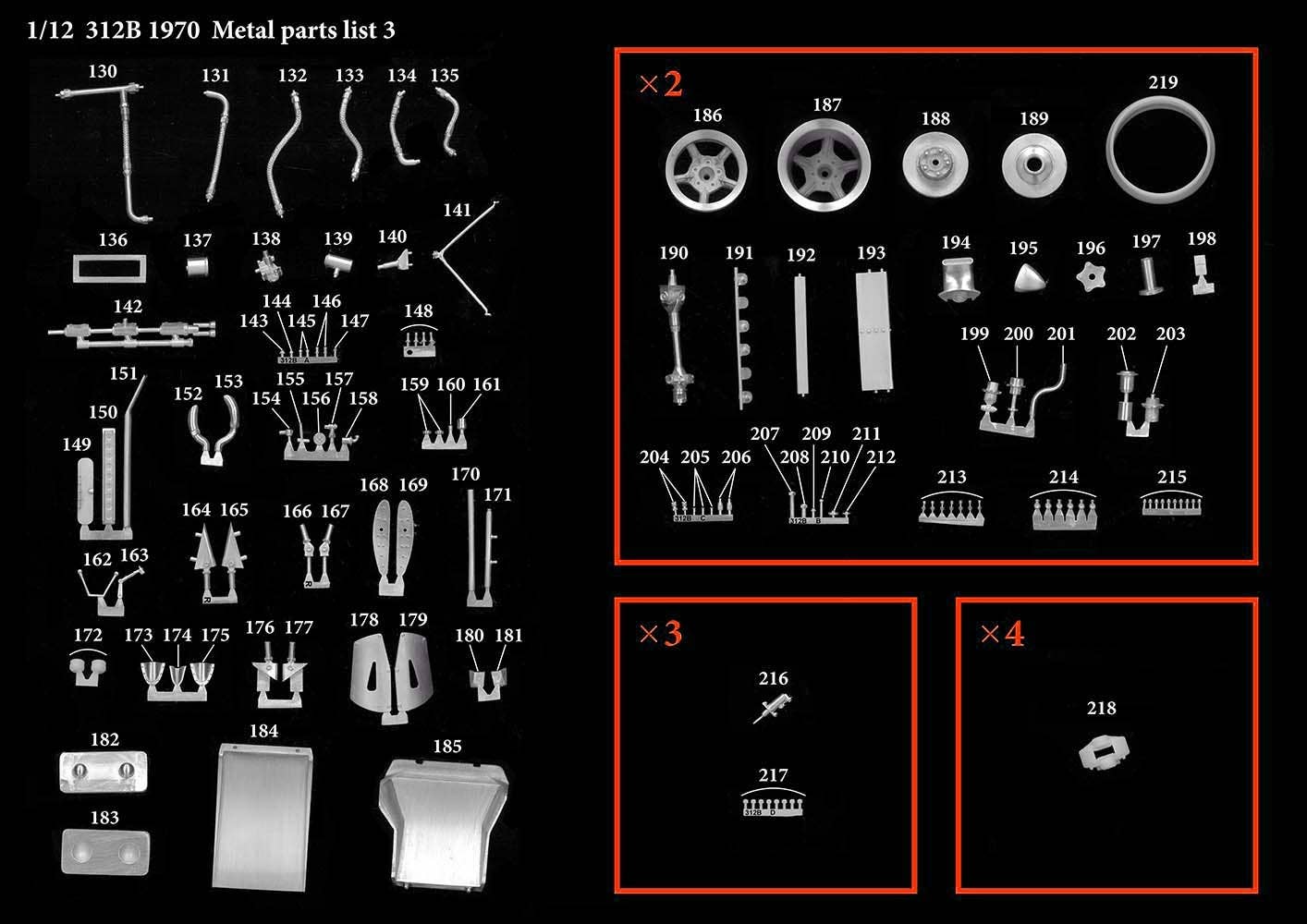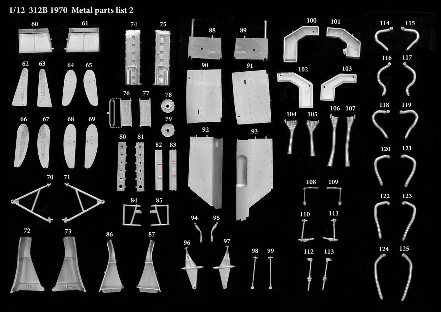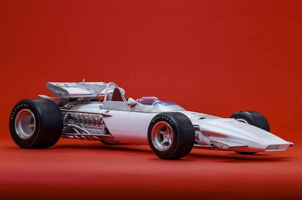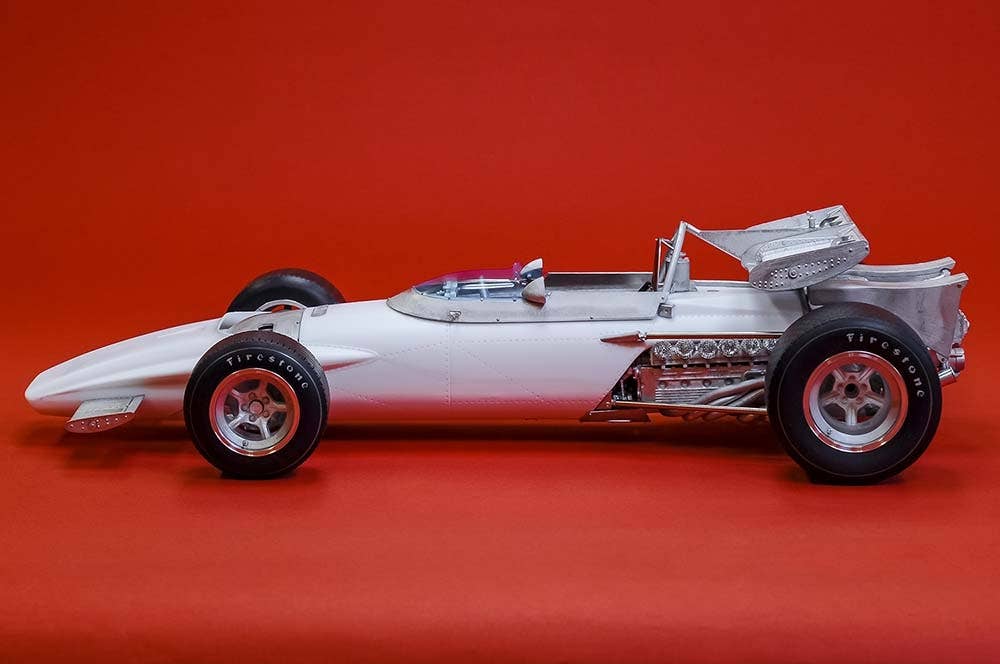 This is a racing car model kit assembled from parts made of resin, white metal, photo-etched metal and possibly other materials.