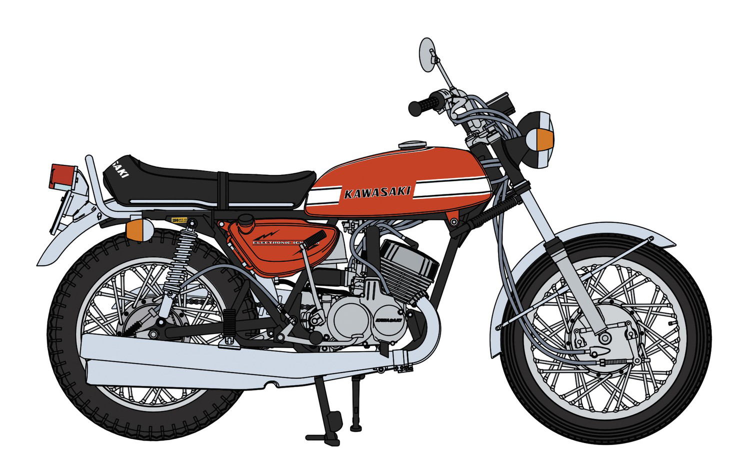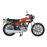 This 1/12-scale model kit from Hasegawa recreates the 1971 Kawasaki 500-SS/MACH III (H1A) in its striking pearl candy red color! Tank parts without any gouges are included; the handlebars, fenders, muffler, headlight mirror, and mirrors are all plated parts. Decals are included for its markings. Order yours today!