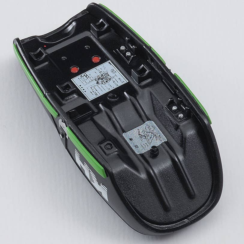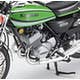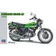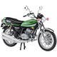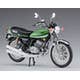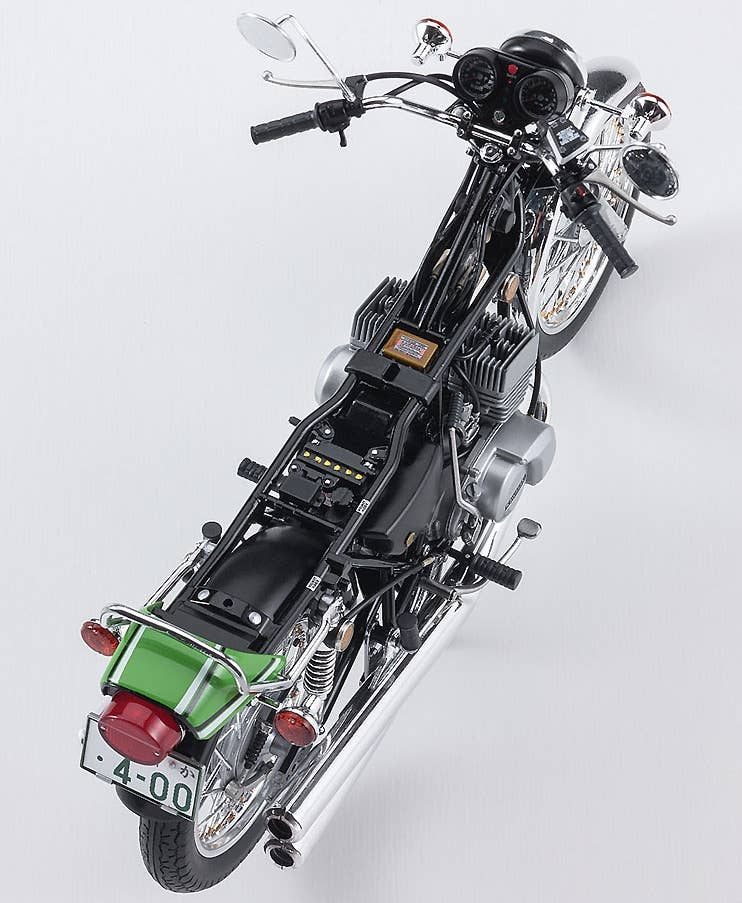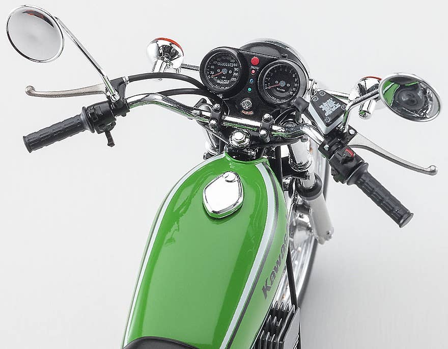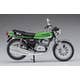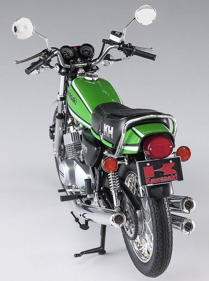 Decals are includes for the body's side line, as well as the "KH" mark. The tank and main body are molded in green, the frame and seat are molded in black, while the engine is molded in light gray. Clear parts are also included for the lights, and plated parts are included for the front fender, wheels, muffler, suspension, and mirrors. It will measure about 165.5mm long when completed. Order today!