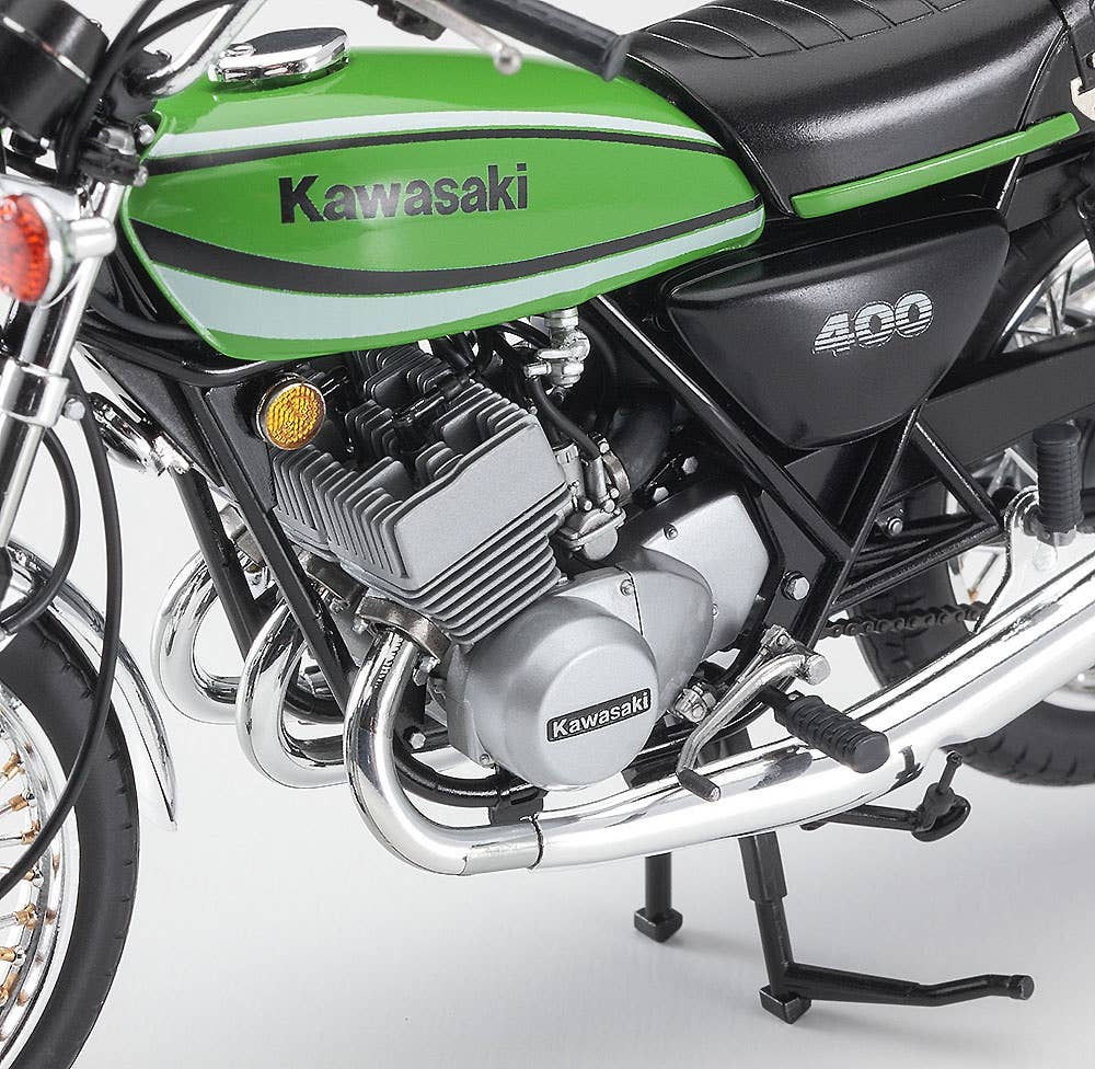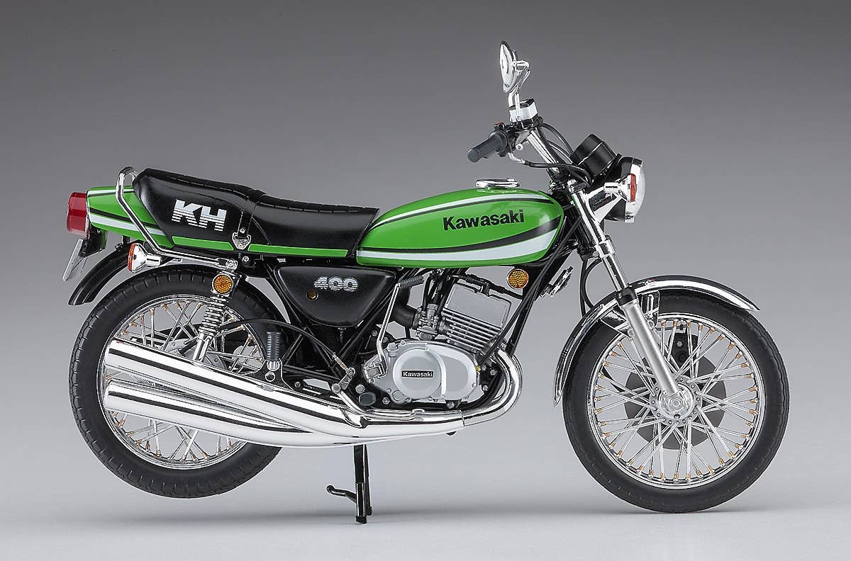 Here comes Hasegawa's kit of the legendary Kawasaki KH400! The Kawasaki KH features a unique 2-stroke, 3-cylinder engine inherited from the Mach series. It's been lovingly nicknamed "Kecchi", and is an on-road bike that is popular even today. The latest model "KH400-A7" with 400cc displacement released in November 1979 with green racing colors, and is the focus of this kit, which features completely new molding after thorough examination of the actual vehicle.