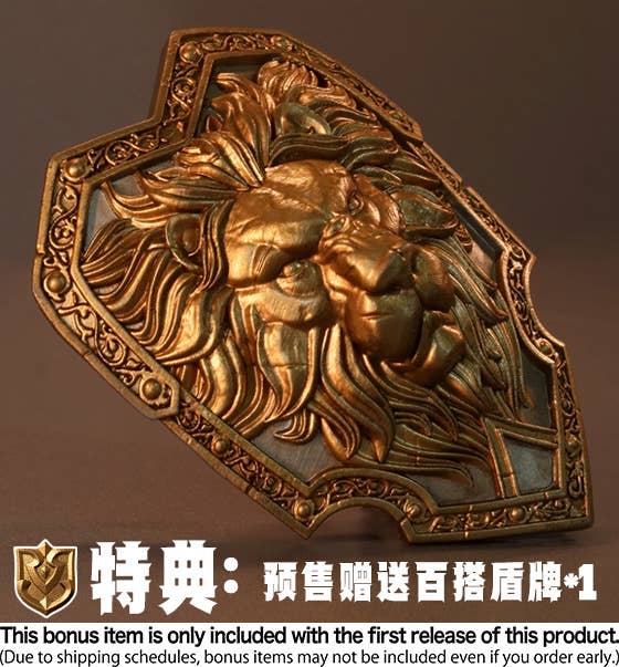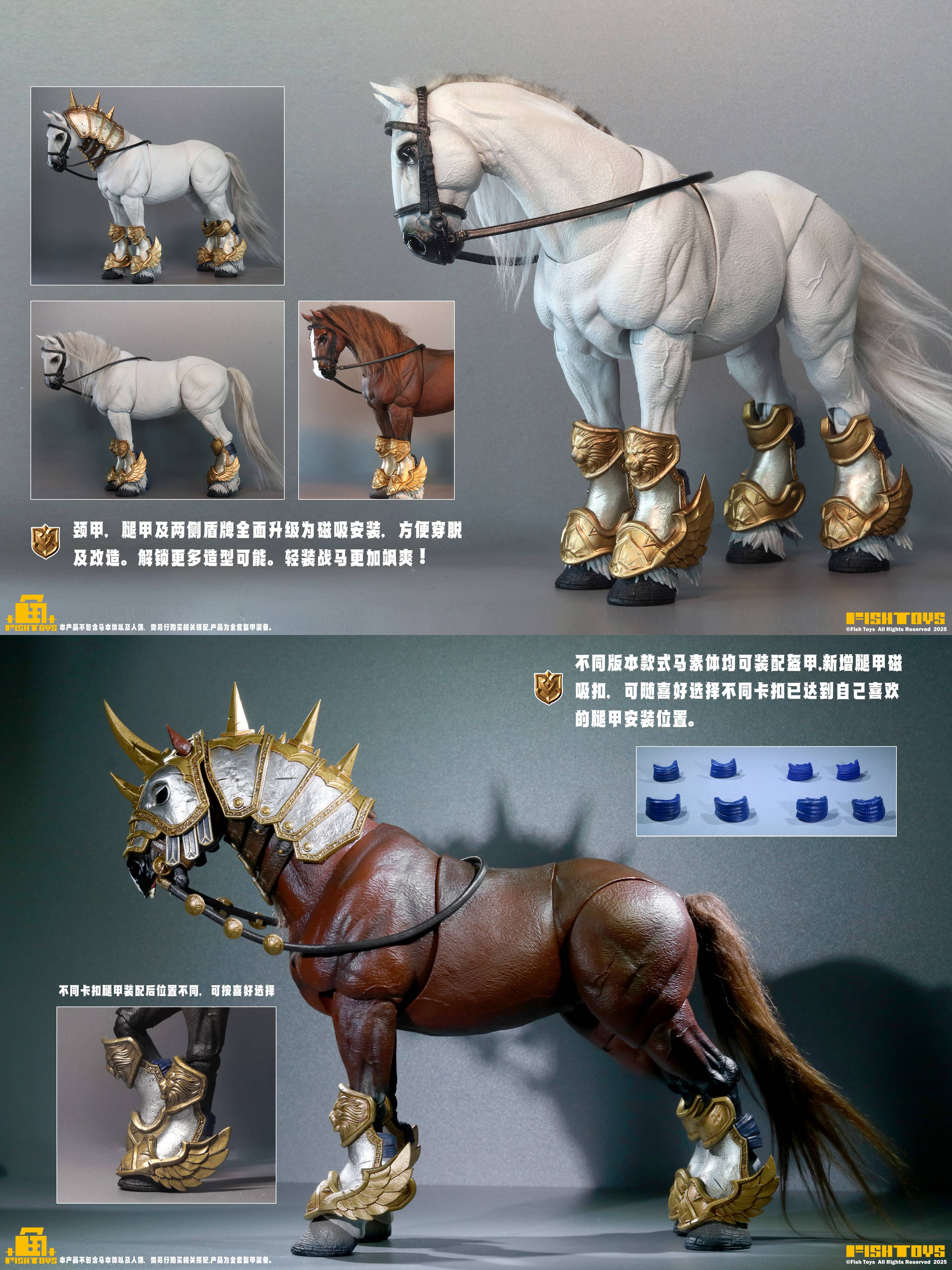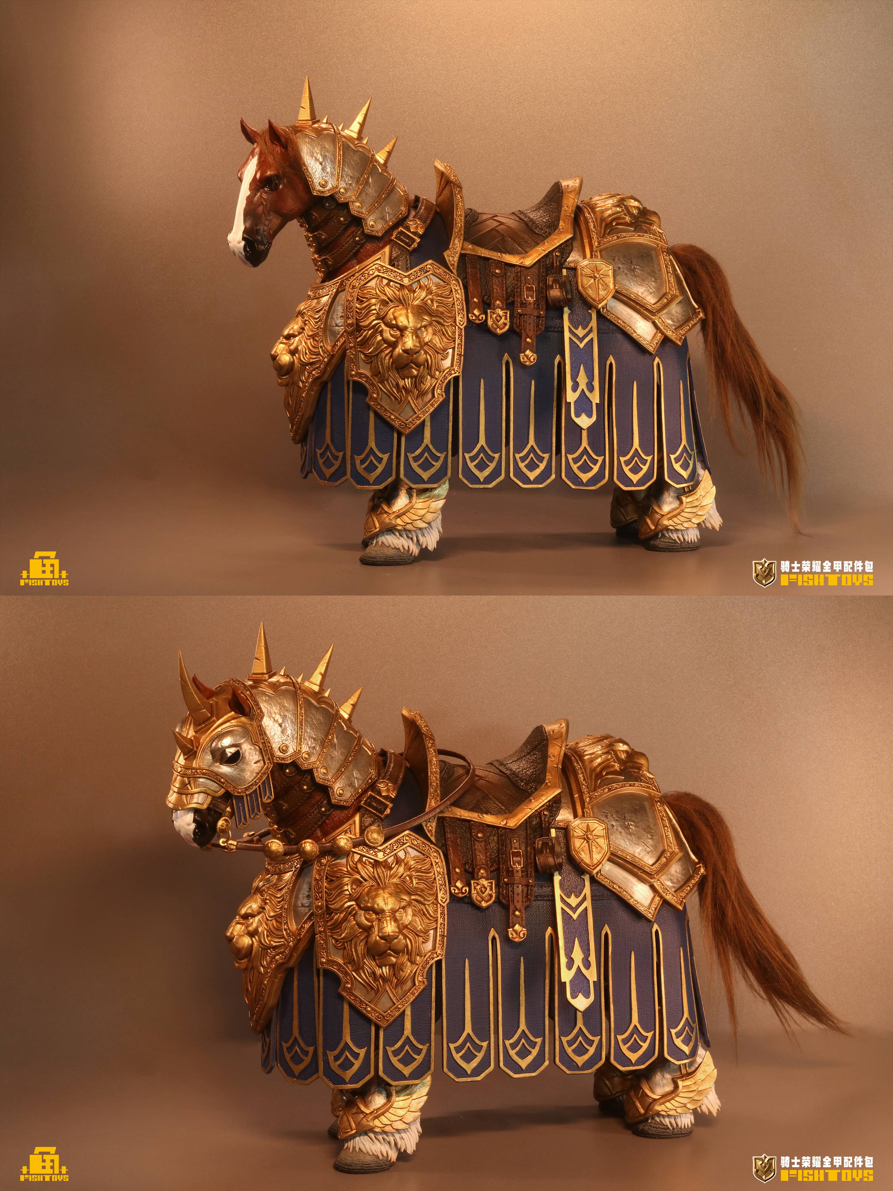 Fish Toys brings us a gorgeous 1/12-scale full armor set for horse action figures! The golden armor features a lion design that gives it a striking presence with its rich sculpt and metallic paintwork. The armor's neck guard, greaves, and shields are magnetic, making them easy to attach and detach, which allows for convenient pose changes and customization! A bonus shield will be included with the first run of this item, too. Order yours today!