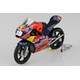 This is a sleek display model of a motorcycle in navy blue with orange accents and sponsorship logos.