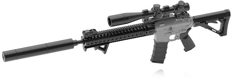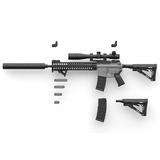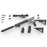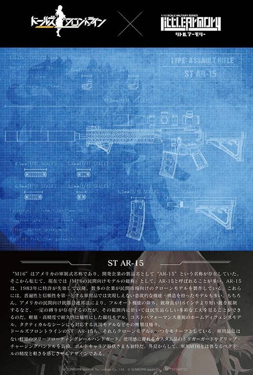 This special collaboration between the "Girls Frontline" game and Tomytec's Little Armory gun-kit lineup brings us the ST AR-15 type -- the civilian version of the military M16! You can choose between a long and short stock for assembly, and two types of backup sights; the suppressor is a standard equipment version. This kit reproduces the differences between the civilian and military versions of this firearm, such as details of the receiver, charging handle, and bolt carrier shape. The hand guard has also been lightened. A special postcard-size illustration card is also included! Your 1/12-scale figures need this -- order yours now!