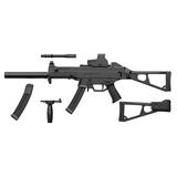 The UMP45 was developed as a low-cost submachine gun using powerful 45ACP ammunition. The UMP9 with a 9mm parabellum was developed as a variation of the diameter; it uses a lot of reinforced plastic to reduce its weight, improve productivity, and ensure corrosion resistance to sea water. A closed bolt system is used to ensure shooting accuracy. This version can be asembled with or without the sound suppressor; the stock can be replaced to reflect its stored state and in-use state. You can choose to assemble it with a holographic sight, and various rail systems and the foregrip can also be interchanged.