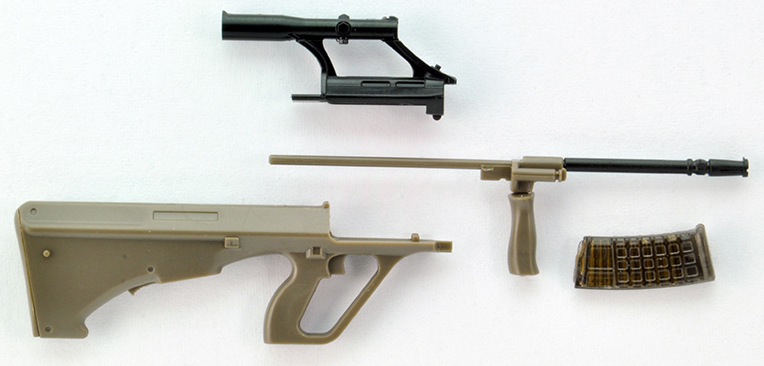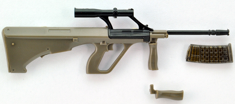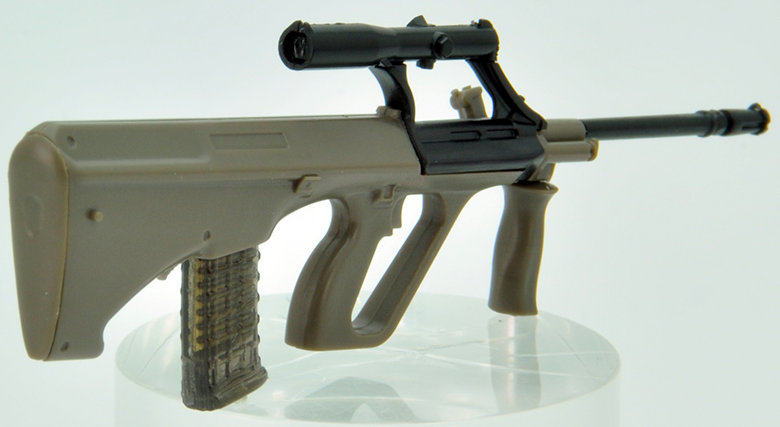 This 1/12-scale Little Armory weapon reproduces the modern bullpup rifle, the AUG. Thanks to its modular construction, the AUG can be used as a machine gun or submachine gun type, and parts can easily be replaced in case of failure too. AUG stands for "Army Universal Gewehr" (Army general purpose rifle).