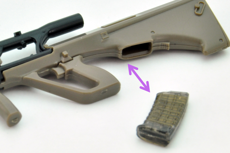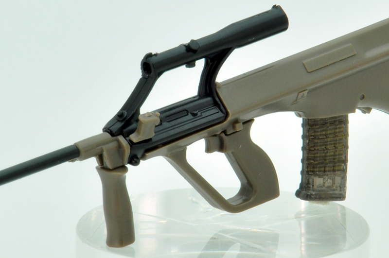 This weapon reproduces the basic military model AUG A1 with a 20-inch barrel; a scope is included. It will be about 6.5cm long when completed; includes PS resin parts on runners. Use of glue for plastic models is recommended. Figma Miya Asato is not included.