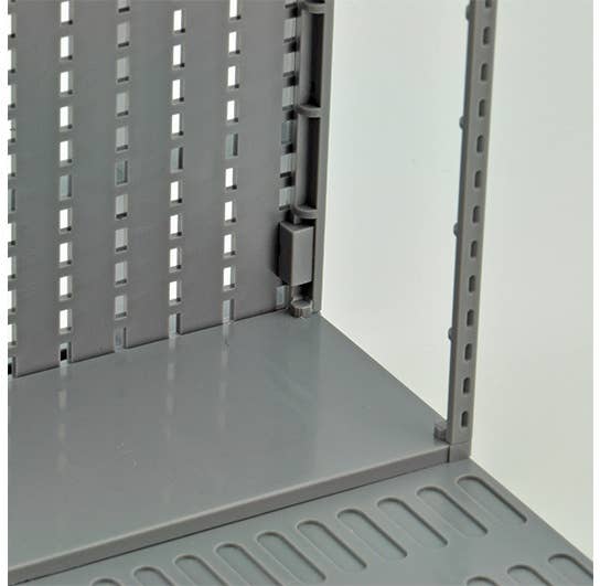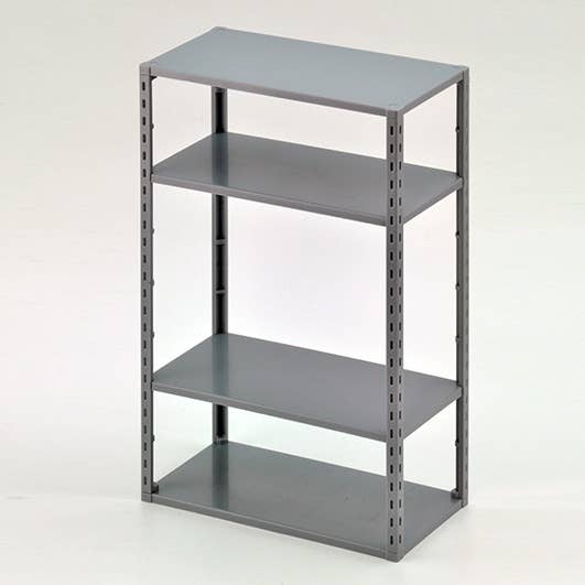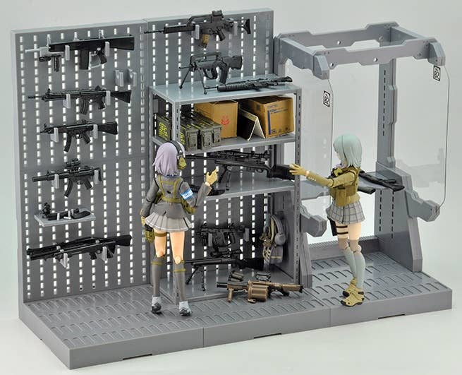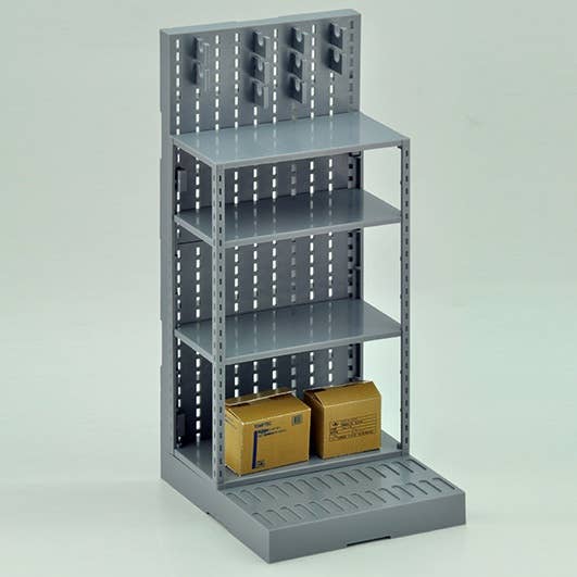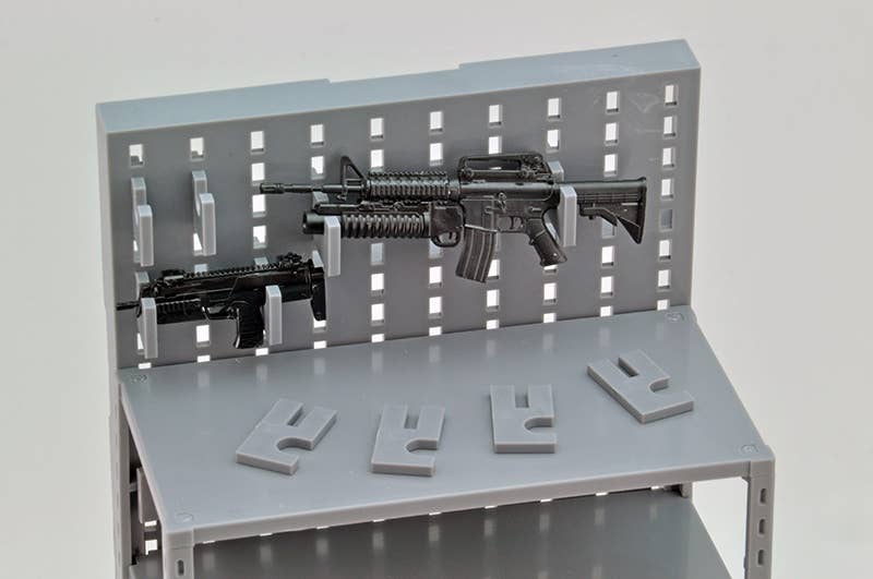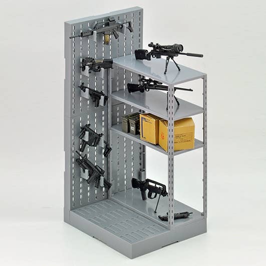 This kit builds a nicely detailed gun rack, made to resemble commonplace steel racks seen in everyday life. Includes a wall and floor unit, gun hooks for the wall and paper craft boxes. Plastic-model cement is recommended.