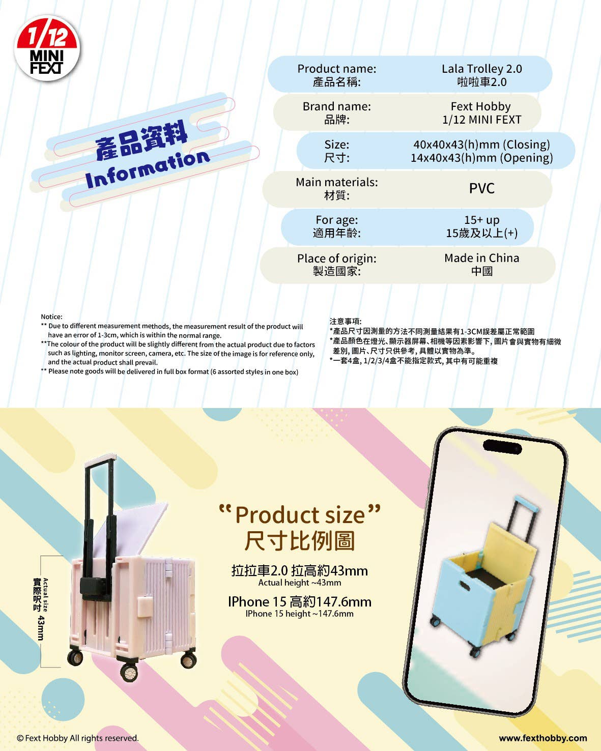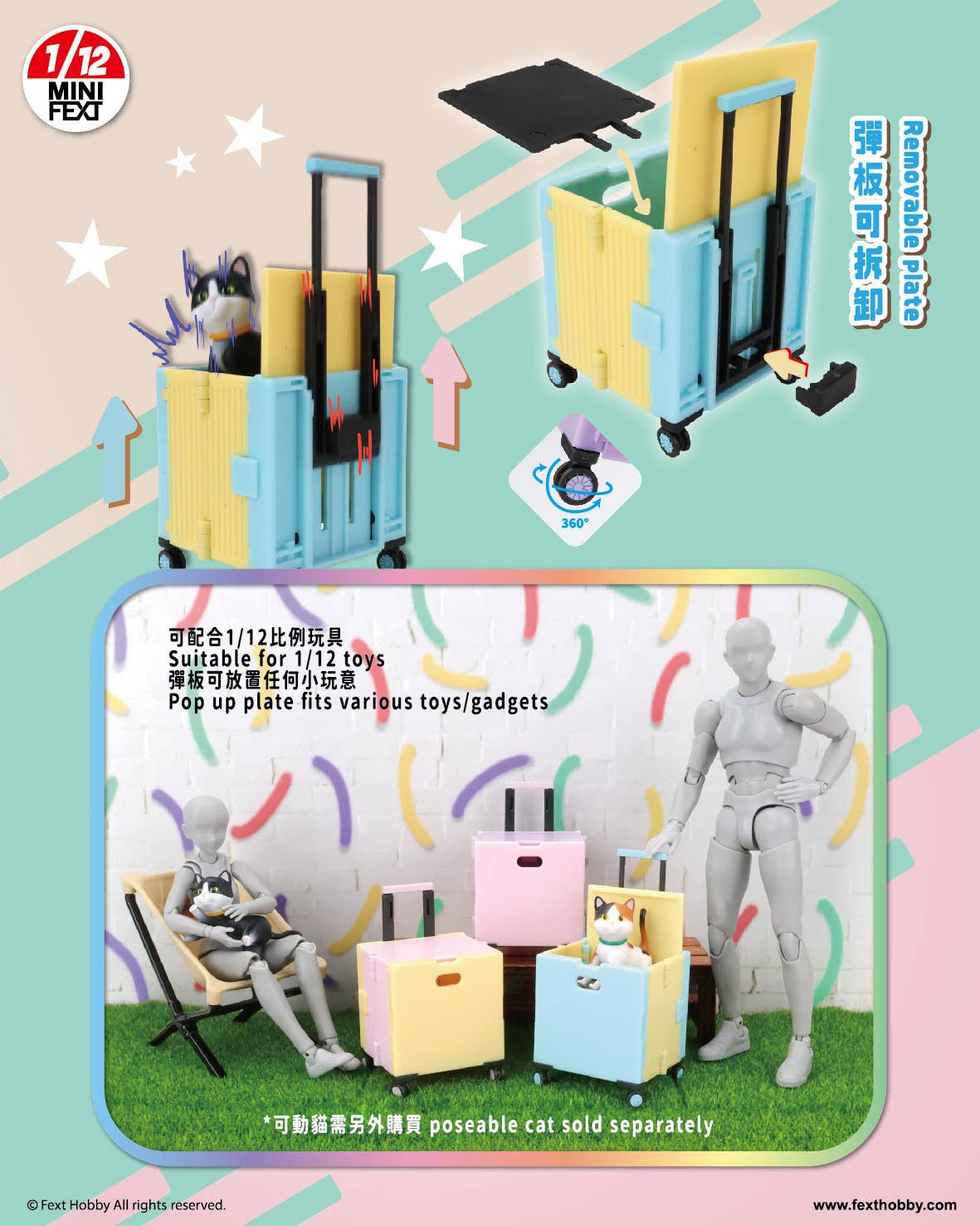 This series of miniature "Laa Laa Trolley 2.0" items from Fext Hobby will enable your 1/12-scale figures to easily carry items from place to place! The top is removable, and the item folds up; you'll love the color schemes too! There are four different items to collect and trade, randomly packed in boxes of four. Order yours today!