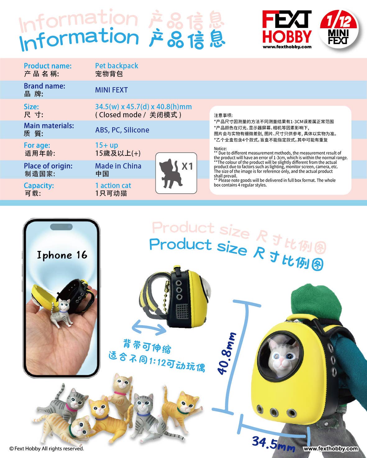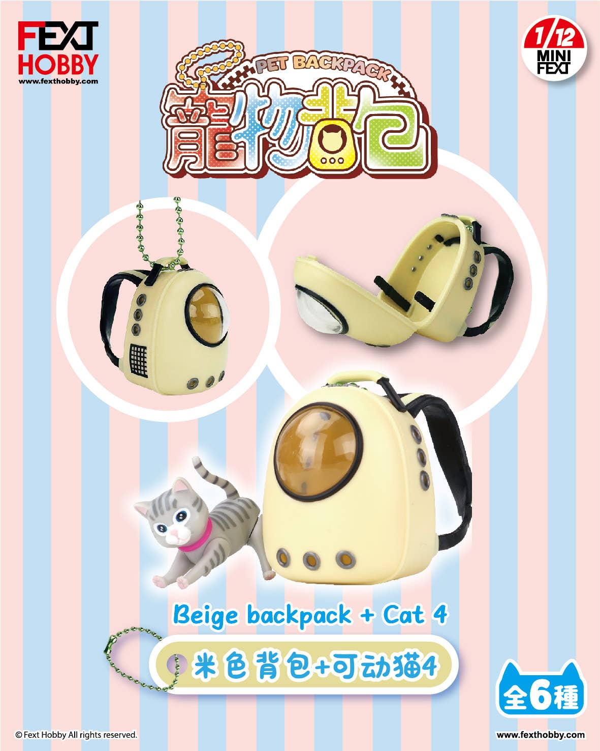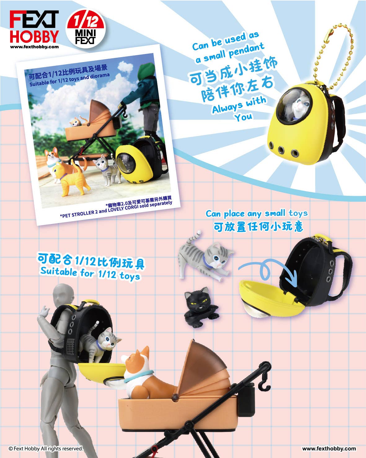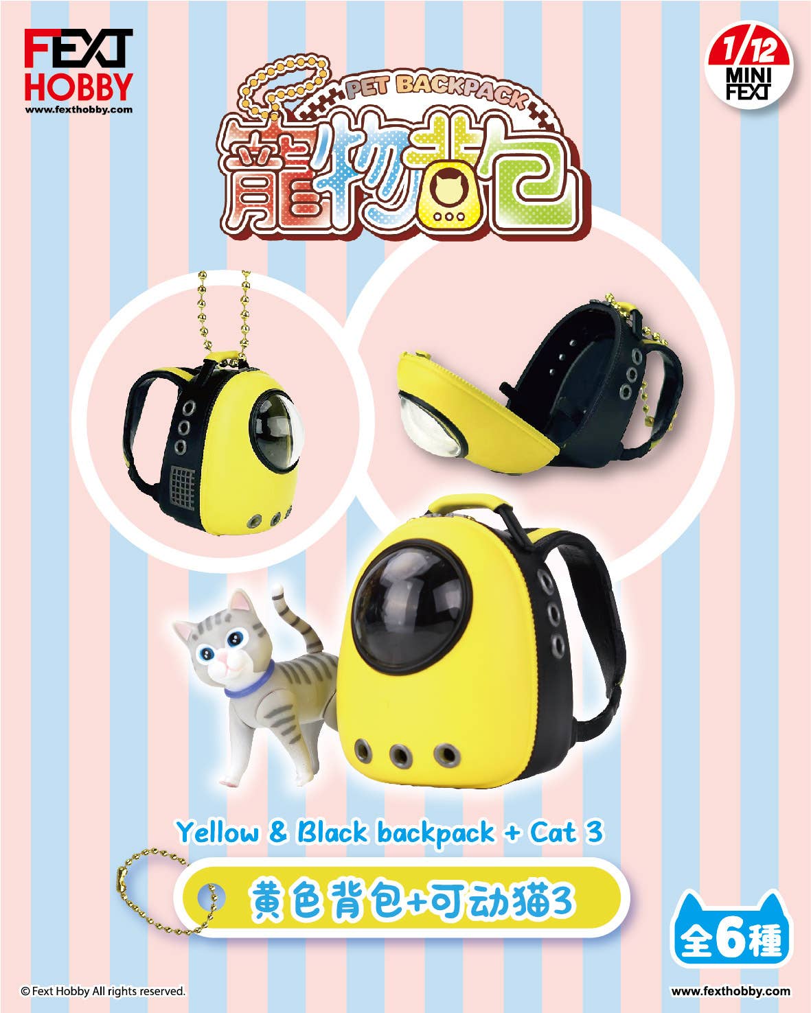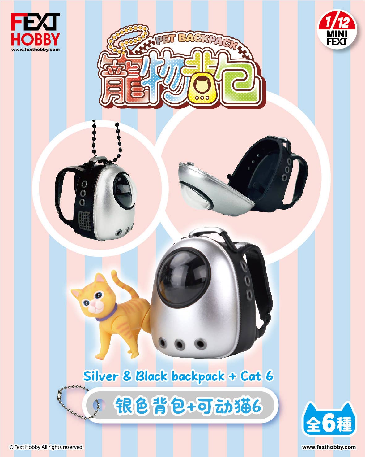 FEXT Hobby brings us a fun lineup of 1/12-scale pet backpacks! Each cute backpack features a clear window, and each one comes with an articulated cat figure that can ride inside the backpack, and can come out to play, too! Each backpack also has a ball chain so you can attach it to your own backpack, bag, or purse. Your 1/12-scale figures will love them! There are six different items to collect and trade, and they're randomly packed in boxes of six. Order yours right meow!