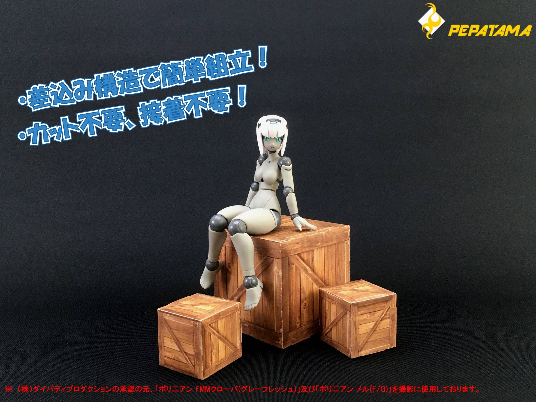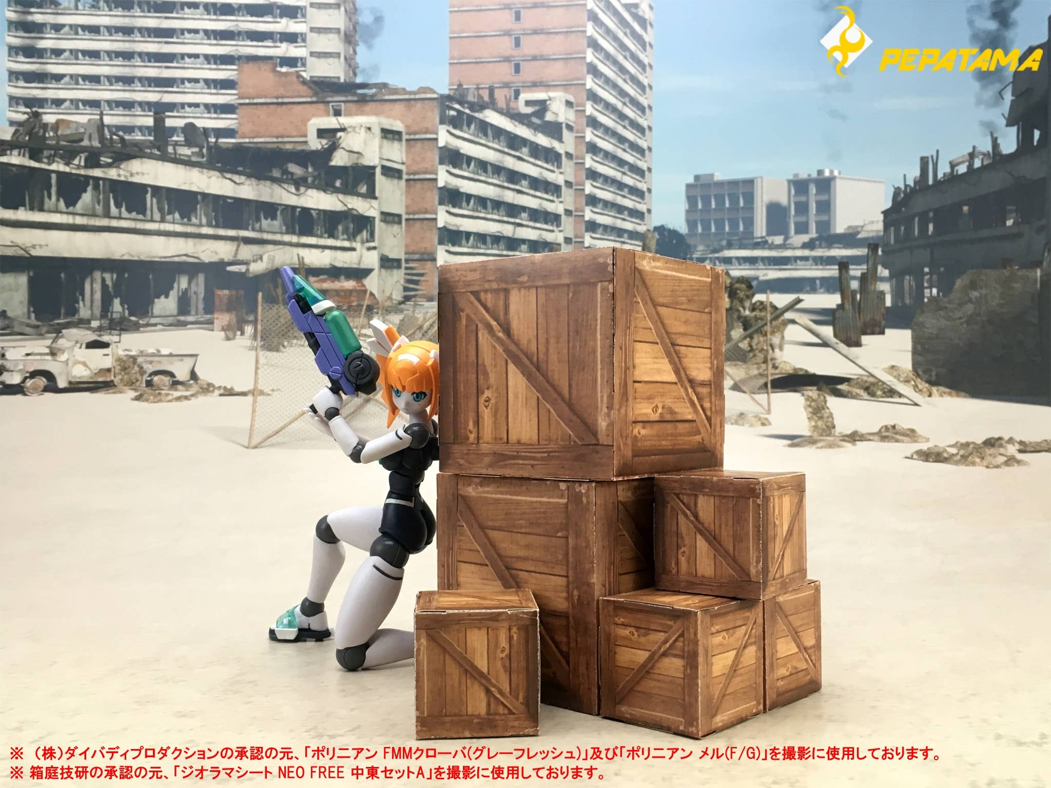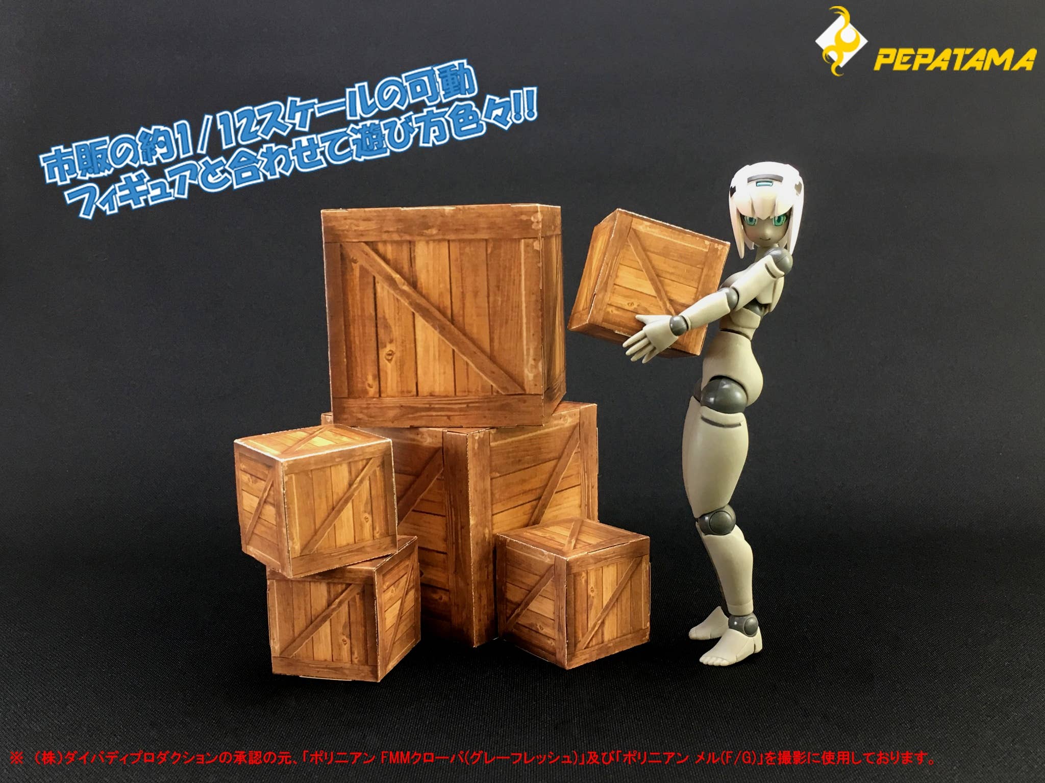 This papercraft set allows you to build 1/12-scale "wooden" crates fast and easy! No cutting is required, and they're water resistant too. Build two large boxes (6cm x 6cm x 6cm) and four small boxes (3cm x 3cm x 3cm).