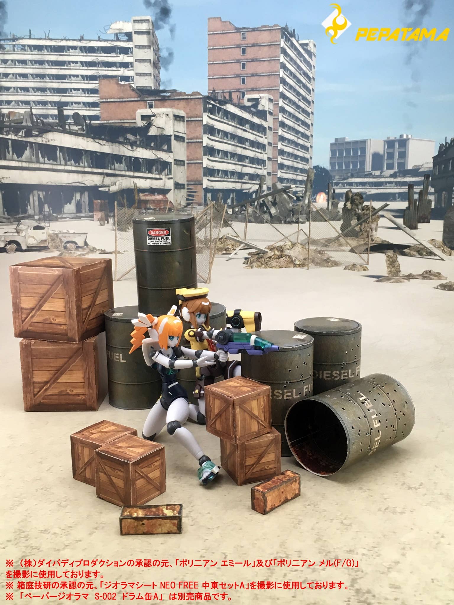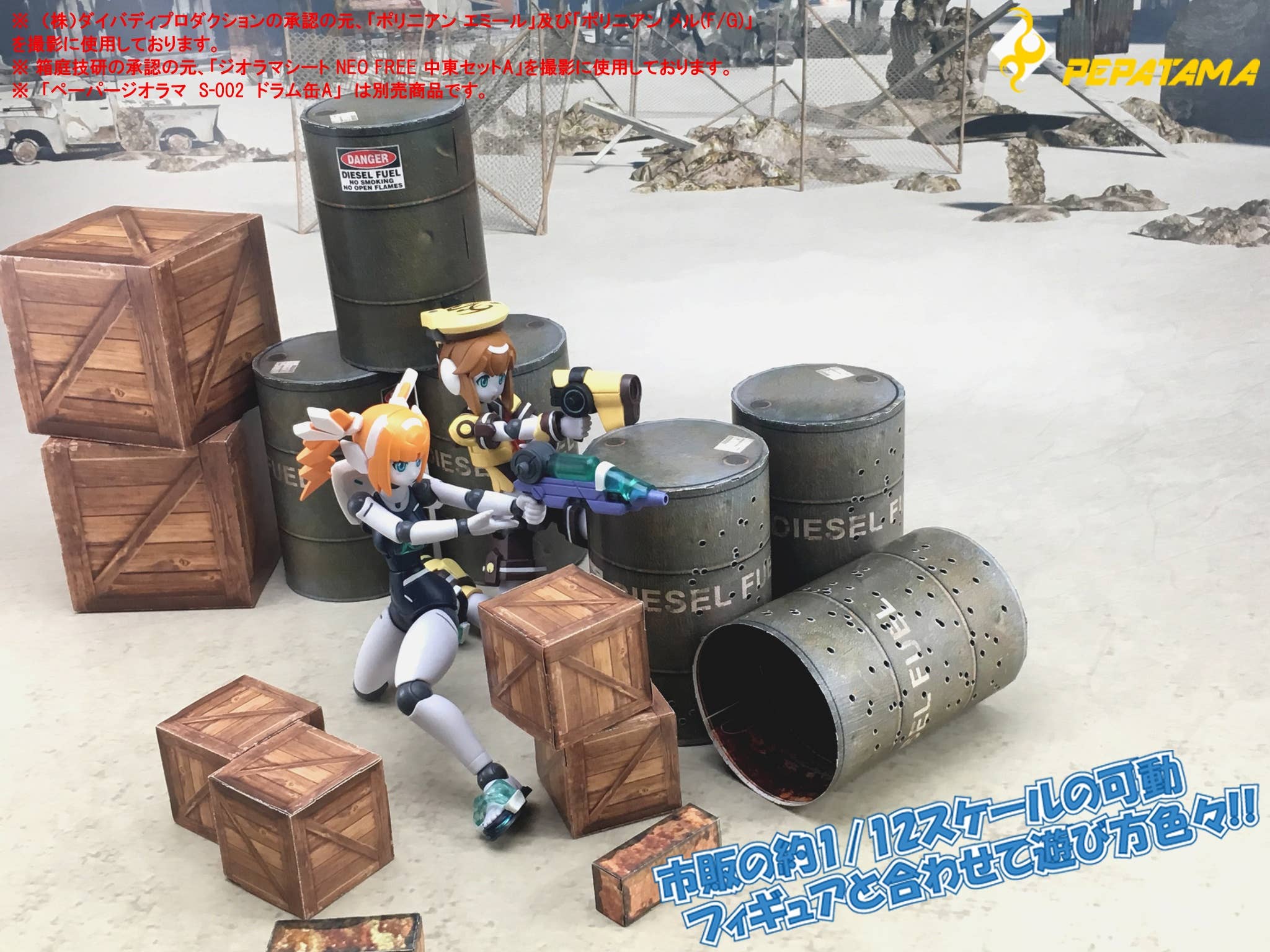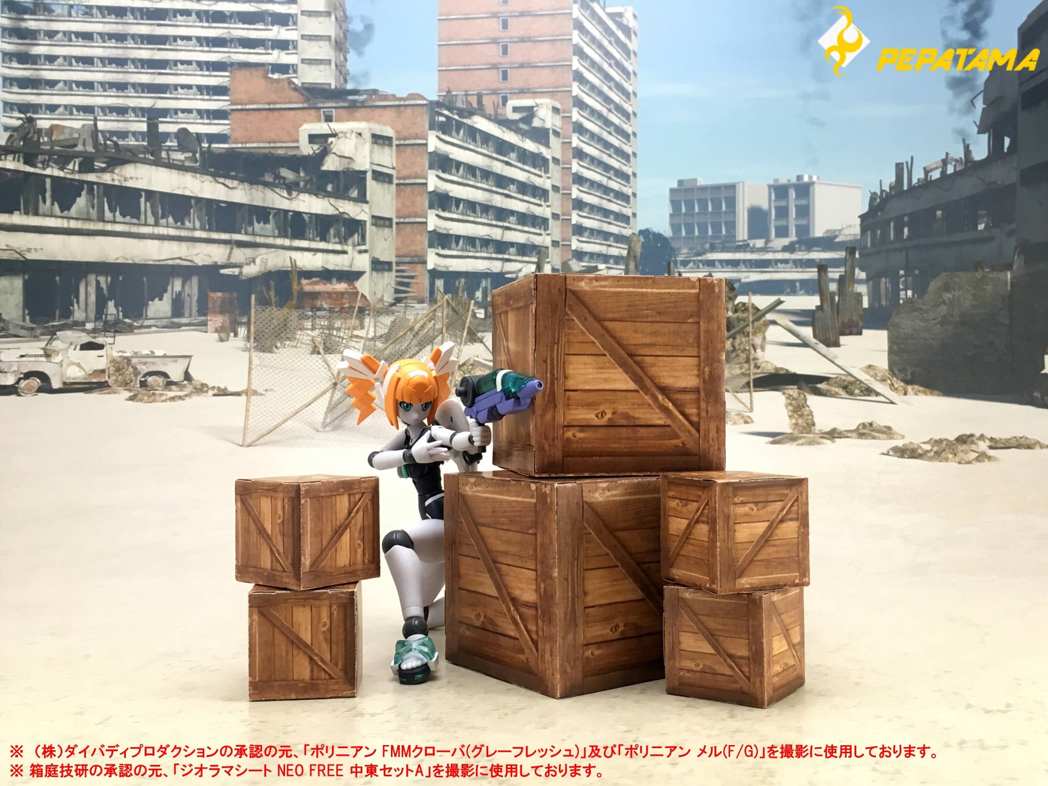 This papercraft set allows you to build 1/12-scale "wooden" crates fast and easy! No cutting is required, and they're water resistant too. Build two large boxes (6cm x 6cm x 6cm) and four small boxes (3cm x 3cm x 3cm).
