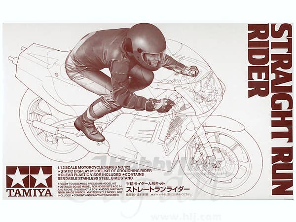 Unassembled, unpainted parts to build a 1/12 scale motorcycle rider, in a crouched "straightaway" riding position. Includes clear pre-cut material for the visor and a stainless steel rod with which to make a bike stand. Motorcycle not included. Decals not included.