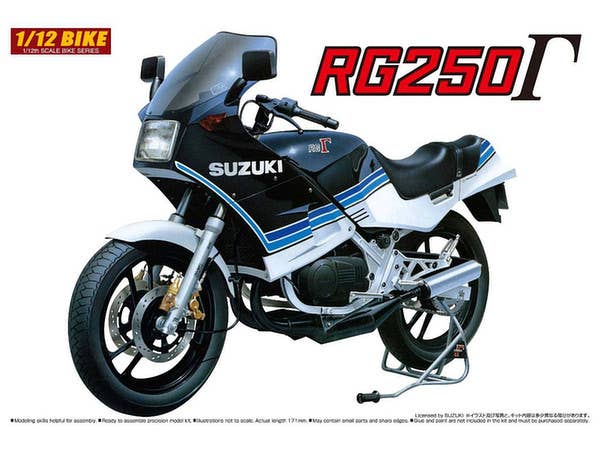 Nice kit of the Suzuki RG250 Gamma, molded in black, white, and matt chrome plated plastic.