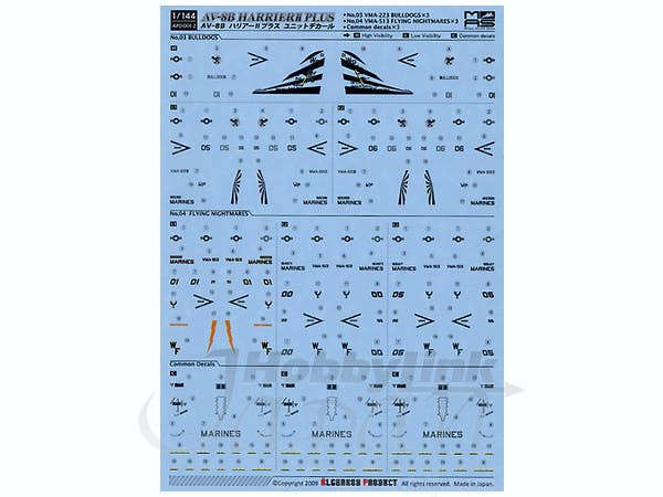 A set of high-quality decals for Revell or Dragon 1/144 AV-8B+ Harrier II kits. Includes stencil data for three aircraft, with modexes and artwork for a total of six aircraft, three each from VMA-223 "Great American Bulldogs" and VMA-513 "Nightmares."
