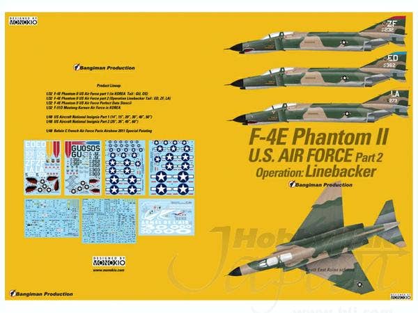 A set of high-quality decals for use with 1/144 scale F-4E Phantom II kits.  Includes markings for three aircraft used in Operation Linebacker.