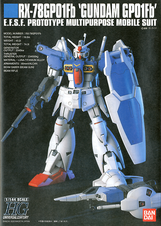 HG version of the GP01Fb. Molded in Bandai's patented multi-gate technology that allows multiple colors on one tree. Core fighter is removable. Includes shield and beam rifle. Rocket thrusters are posable.