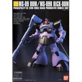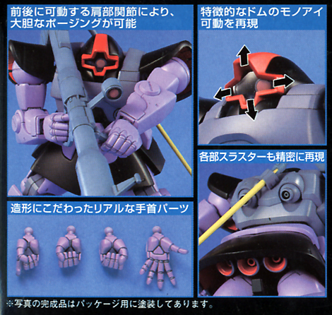 Build yourself a Dom or a Rick-Dom with this set; parts are included to build one or the other (unfortunately not both!). The pictorial instructions indicate where the alternate parts go, so be careful when building! Weapons for both versions are included, as are foil stickers for the eyes. All the parts are molded in color and snap together so paint and glue are not necessary.