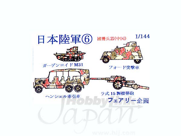 Beautiful little 1/144-scale resin-cast military kits from Fairy Kikaku of Japan! This set includes four vehicle kits, as shown here: Garden-Lloyd M31, Ford Assault Car, Henschel Troop Carrier, and Ra-Type 15 Field Cannon. Markings not included.