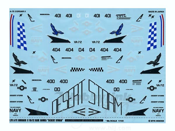 A set of high-quality decals for 1/144 Corsair II kits. Includes markings for three aircraft of VA-72 "Blue Hawks" from Desert Storm: AC/404 and AC/401 in standard lo-vis markings, and CAG bird AC/400 in the special sand-and-brown desert scheme with "Desert Storm" logo that was made famous in photos during and after the war.