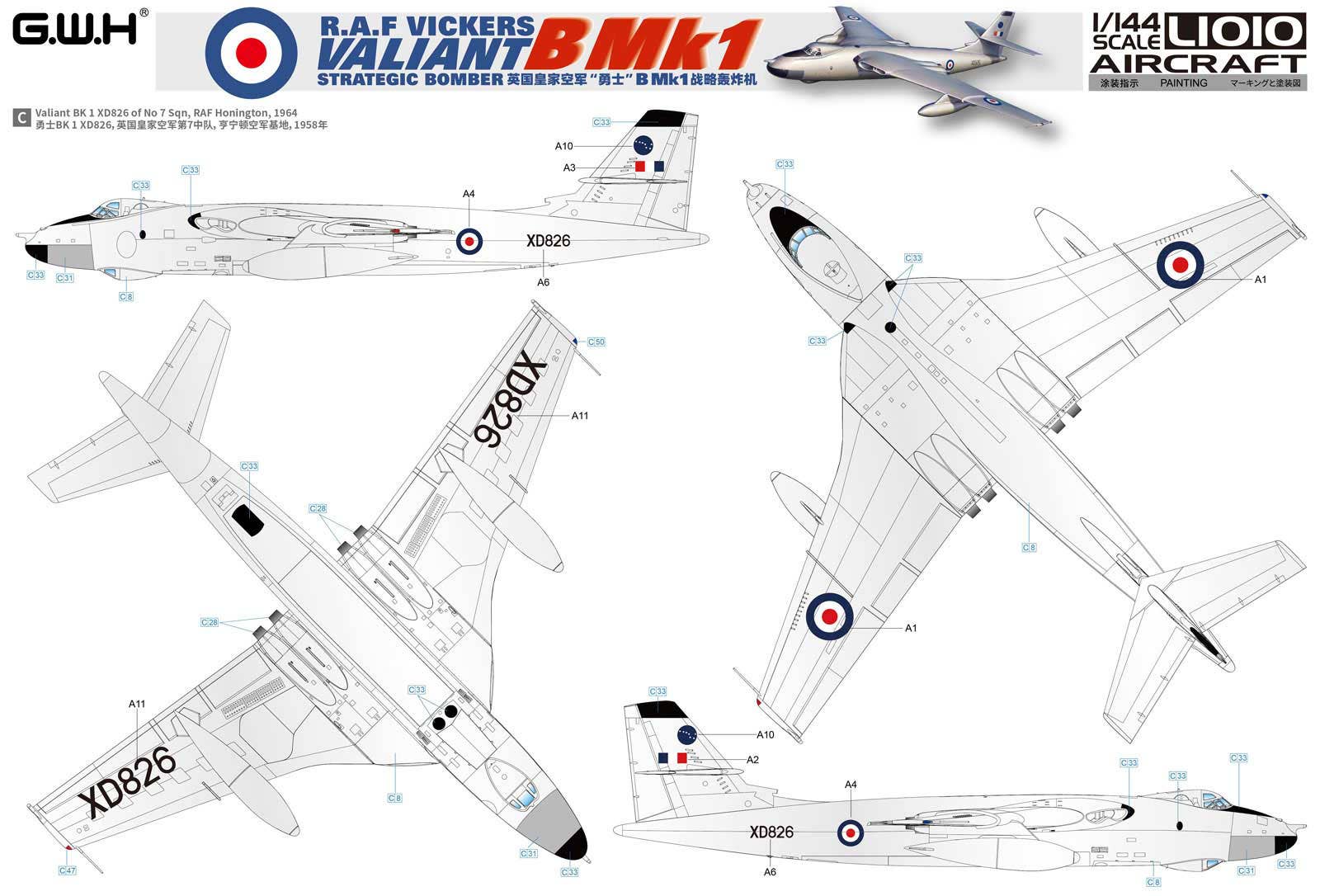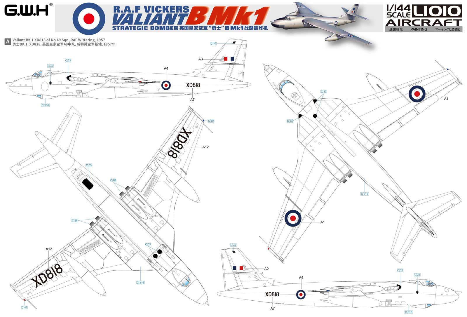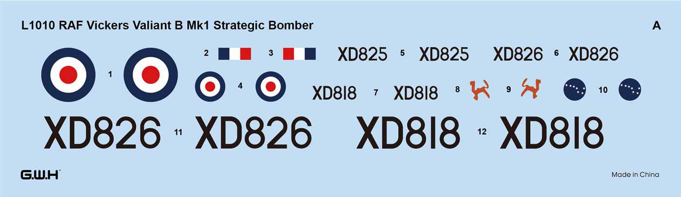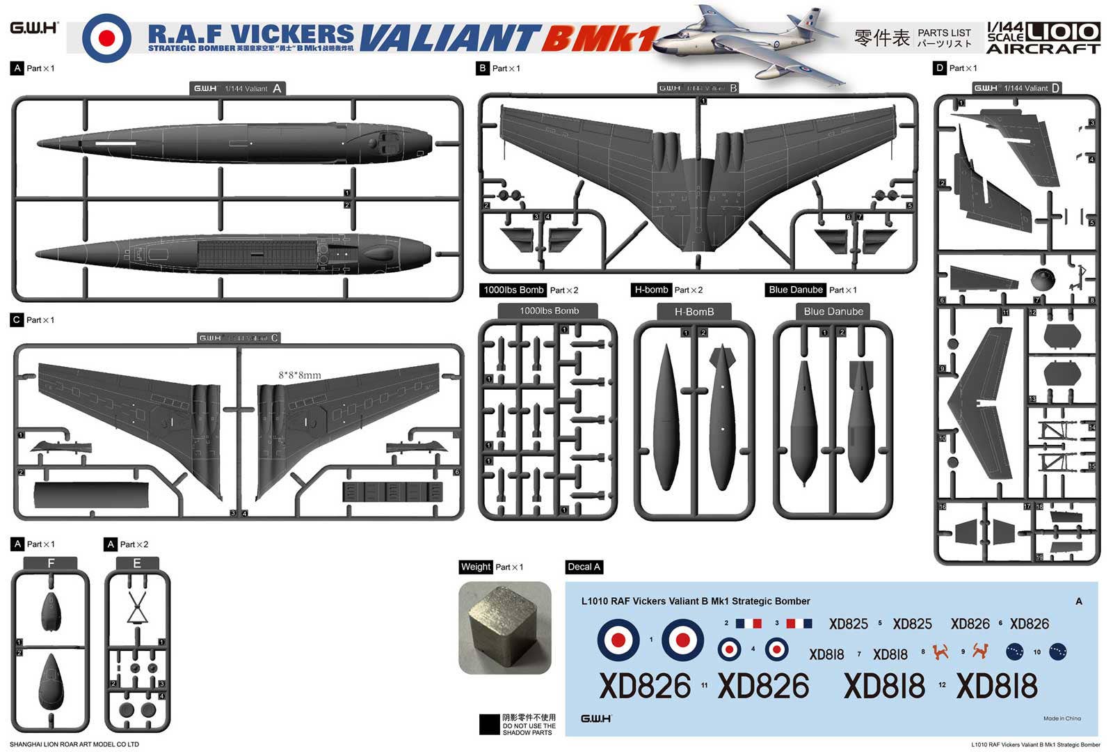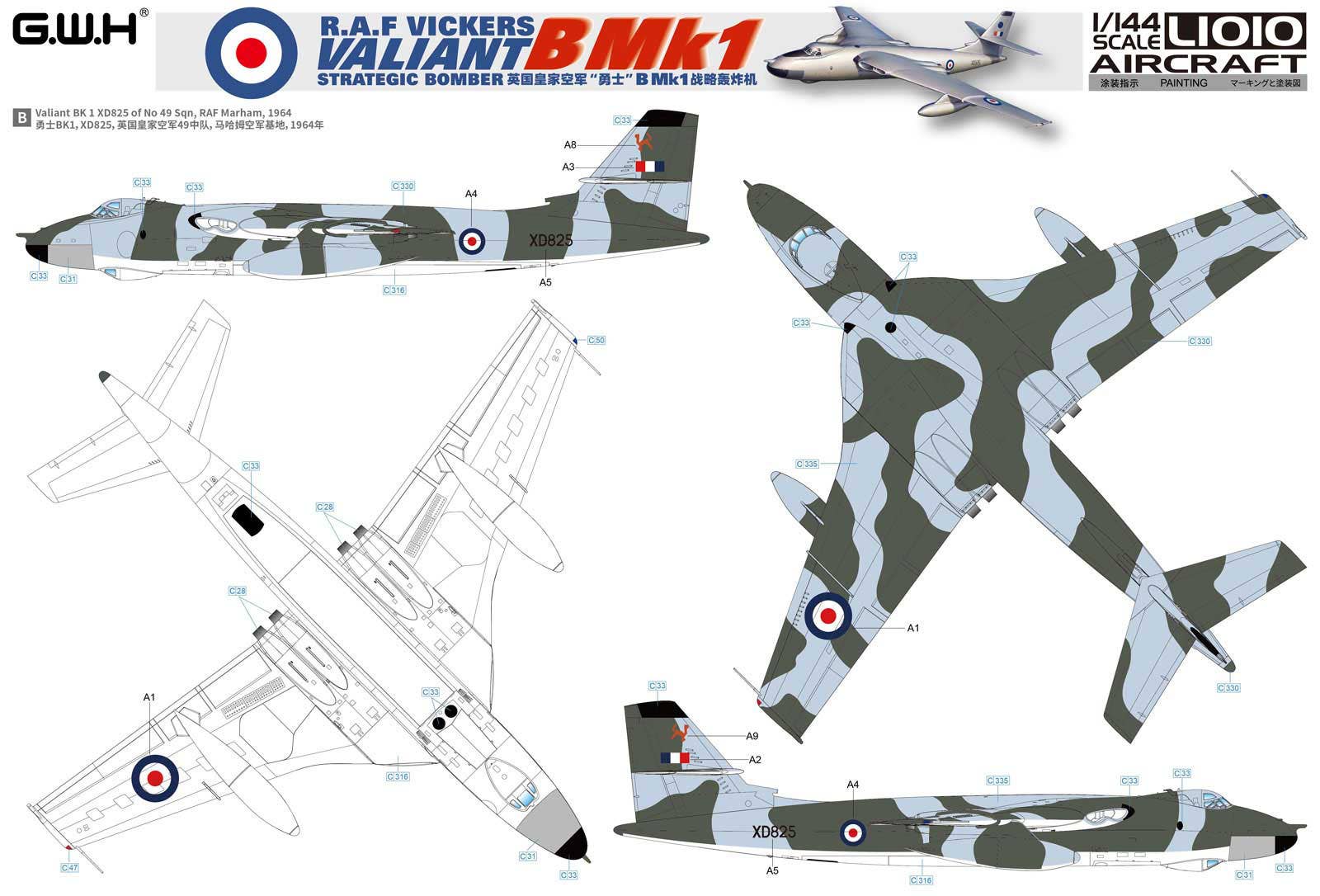Pit-Road's 1/144-scale model kit of the Royal Air Force strategic bomber Valiant B.Mk.1 comes with 22 thousand-pound bombs, as well as nose weight parts; the bomb bay can be built opened or closed, and decals for three versions (XD818 from No. 49 Squadron, XD825 from No. 49 Squadron, and SD826 from No. 7 Squadron) are included. Place your order today!