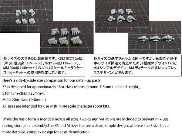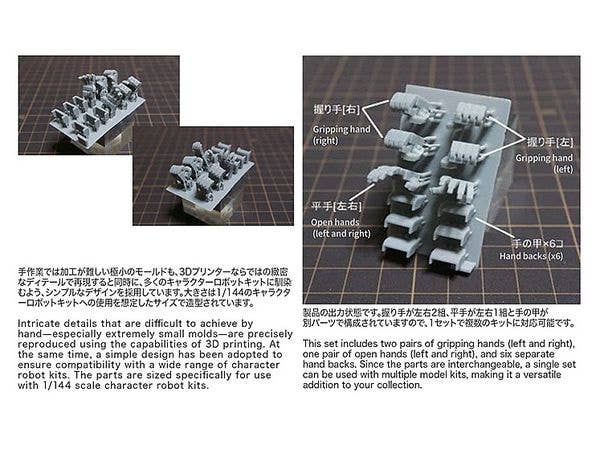 To address this, we've developed a lineup of three sizes compatible with 1/144 scale kits. Each hand is designed with simple, minimal detailing to blend naturally with a wide variety of robot character models.