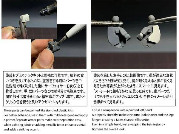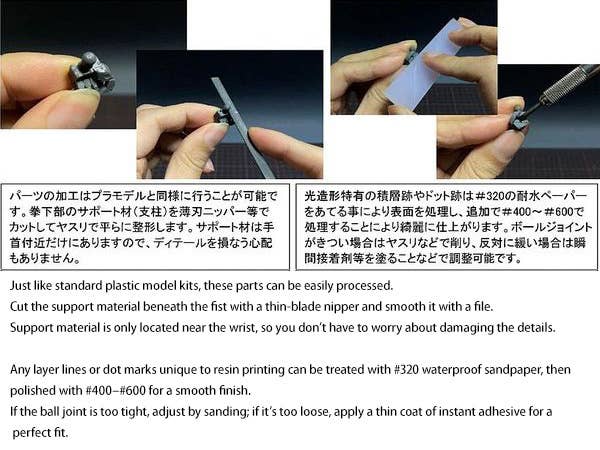While many aftermarket hand parts are available as replacements for standard kit parts, they often feature an excess of detail that can appear out of place when attached to certain kits. Moreover, most of these parts are designed for robots in the 18-20 meter class, and using them on smaller robots can result in unnatural proportions.